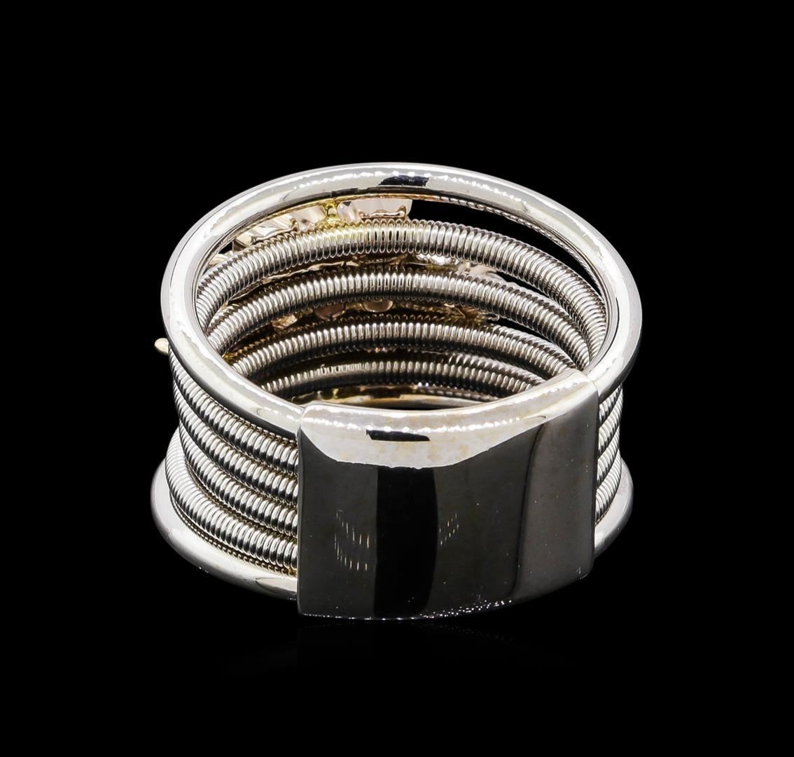 One electronically tested 14KT white and yellow gold lady's combination cast & assembled fashion ring with a wide band with a bright polish finish. The featured lady's ring has a six band motif and shank measuring 10.64 millimeters wide. Identified with markings of '14K'. Condition is new, good workmanship. Containing: Three prong set round brilliant cut diamonds, measuring 2.55 - 2.45 x 1.55mm (depth est.) approximate total weight of 3 Stones = 0.18ct. Graded in the setting. Clarity SI-2 to I-1. Color: H - I Cut Good Ten prong set round brilliant cut diamonds, measuring 2.40 - 2.30 x 1.46mm (depth est.) approximate total weight of 10 Stones = 0.51ct. Graded in the setting. Clarity SI-1 to SI-2. Color: H - I Cut Good Two prong set round brilliant cut diamonds, measuring 2.00 - 1.95 x 1.23mm (depth est.) approximate total weight of 2 Stones = 0.06ct. Graded in the setting. Clarity SI-2 to I-1. Color: H - I Cut Good. Total Weight of Diamonds 0.75ct.. Total Weight of Ring 12.90gm. GAS Appraised.