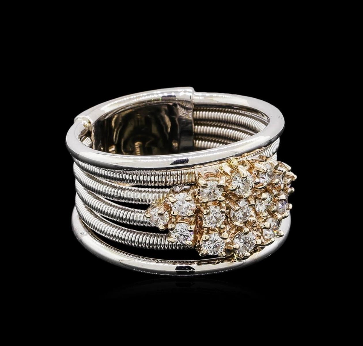One electronically tested 14KT white and yellow gold lady's combination cast & assembled fashion ring with a wide band with a bright polish finish. The featured lady's ring has a six band motif and shank measuring 10.64 millimeters wide. Identified with markings of '14K'. Condition is new, good workmanship. Containing: Three prong set round brilliant cut diamonds, measuring 2.55 - 2.45 x 1.55mm (depth est.) approximate total weight of 3 Stones = 0.18ct. Graded in the setting. Clarity SI-2 to I-1. Color: H - I Cut Good Ten prong set round brilliant cut diamonds, measuring 2.40 - 2.30 x 1.46mm (depth est.) approximate total weight of 10 Stones = 0.51ct. Graded in the setting. Clarity SI-1 to SI-2. Color: H - I Cut Good Two prong set round brilliant cut diamonds, measuring 2.00 - 1.95 x 1.23mm (depth est.) approximate total weight of 2 Stones = 0.06ct. Graded in the setting. Clarity SI-2 to I-1. Color: H - I Cut Good. Total Weight of Diamonds 0.75ct.. Total Weight of Ring 12.90gm. GAS Appraised.