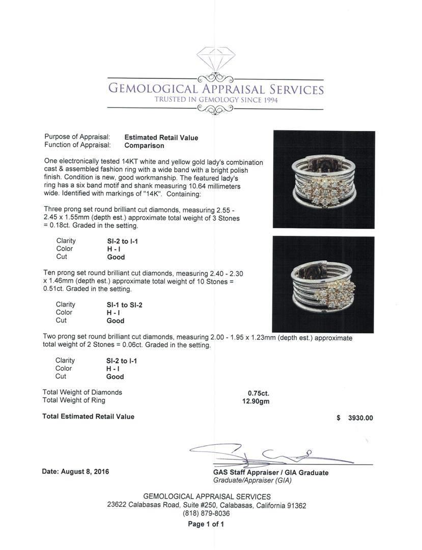One electronically tested 14KT white and yellow gold lady's combination cast & assembled fashion ring with a wide band with a bright polish finish. The featured lady's ring has a six band motif and shank measuring 10.64 millimeters wide. Identified with markings of '14K'. Condition is new, good workmanship. Containing: Three prong set round brilliant cut diamonds, measuring 2.55 - 2.45 x 1.55mm (depth est.) approximate total weight of 3 Stones = 0.18ct. Graded in the setting. Clarity SI-2 to I-1. Color: H - I Cut Good Ten prong set round brilliant cut diamonds, measuring 2.40 - 2.30 x 1.46mm (depth est.) approximate total weight of 10 Stones = 0.51ct. Graded in the setting. Clarity SI-1 to SI-2. Color: H - I Cut Good Two prong set round brilliant cut diamonds, measuring 2.00 - 1.95 x 1.23mm (depth est.) approximate total weight of 2 Stones = 0.06ct. Graded in the setting. Clarity SI-2 to I-1. Color: H - I Cut Good. Total Weight of Diamonds 0.75ct.. Total Weight of Ring 12.90gm. GAS Appraised.
