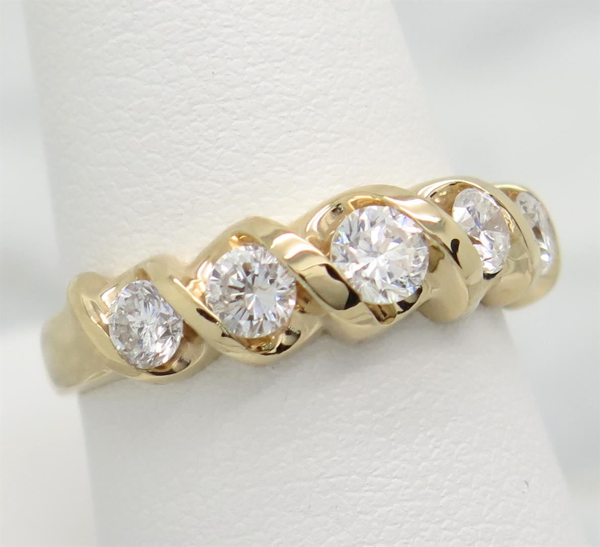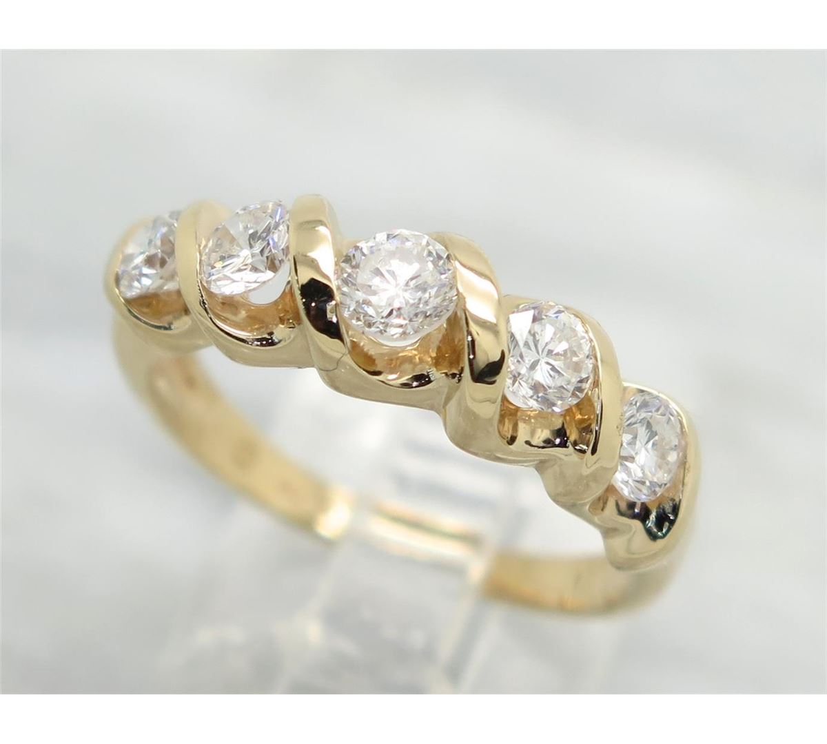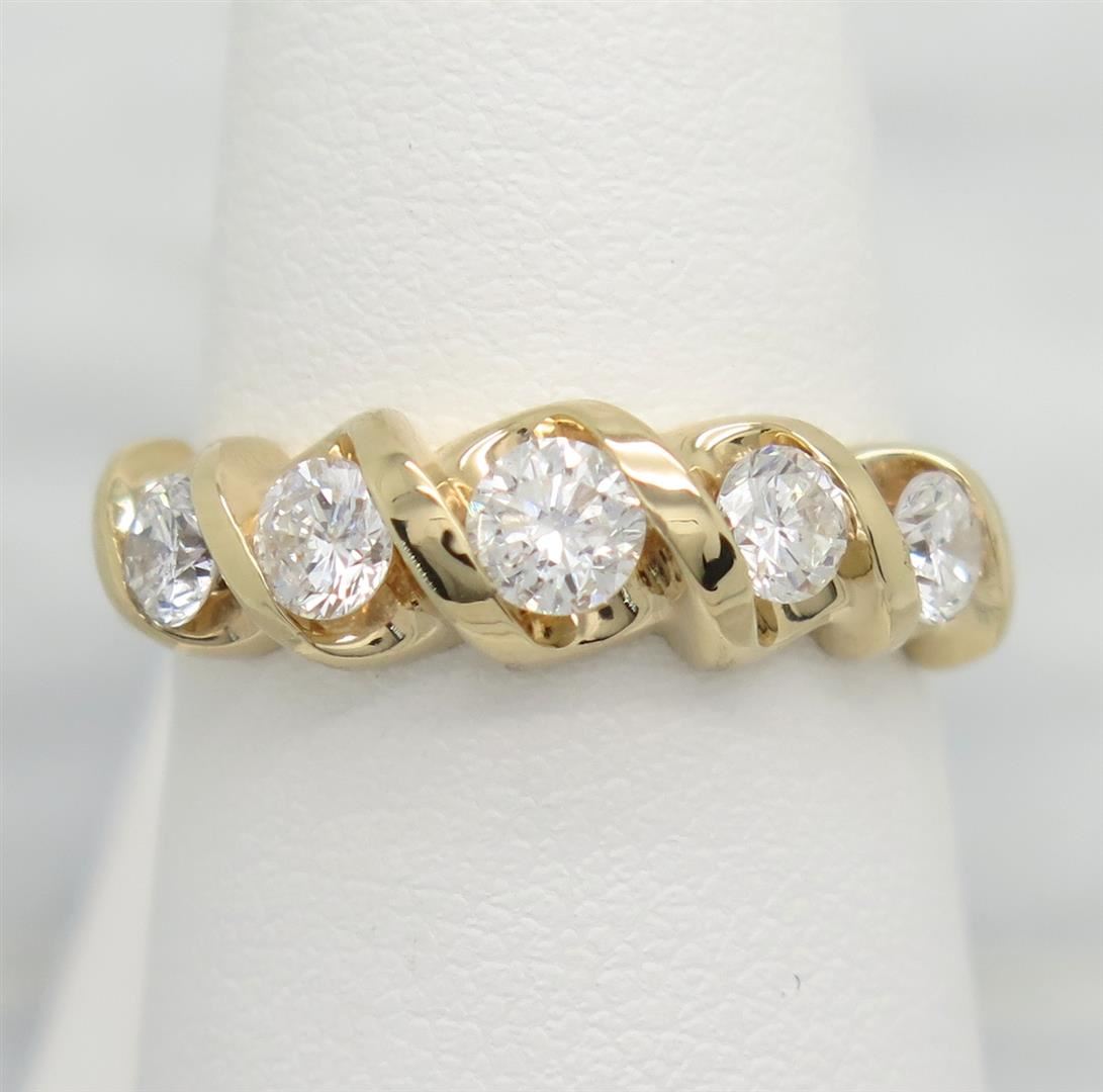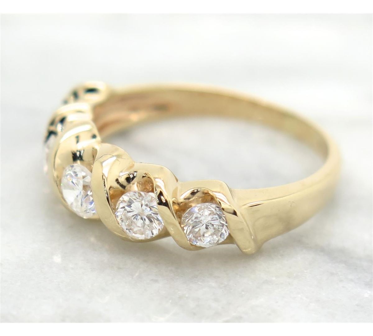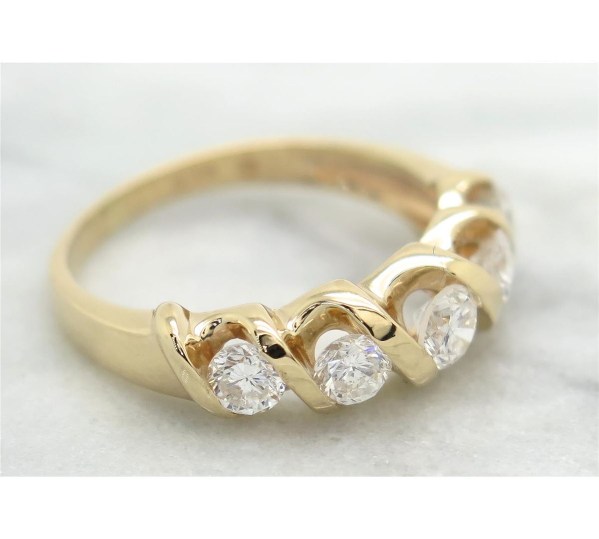 One tested 14K white gold diamond ring. Condition is new. Containing: Five Round Brilliant cut diamonds with F-H color, SI-I clarity. Approximate total diamond weight: .75CTW. Diamonds are graded in the mounting, unless otherwise stated. Weight: 4.0 grams. Size: 7.0
