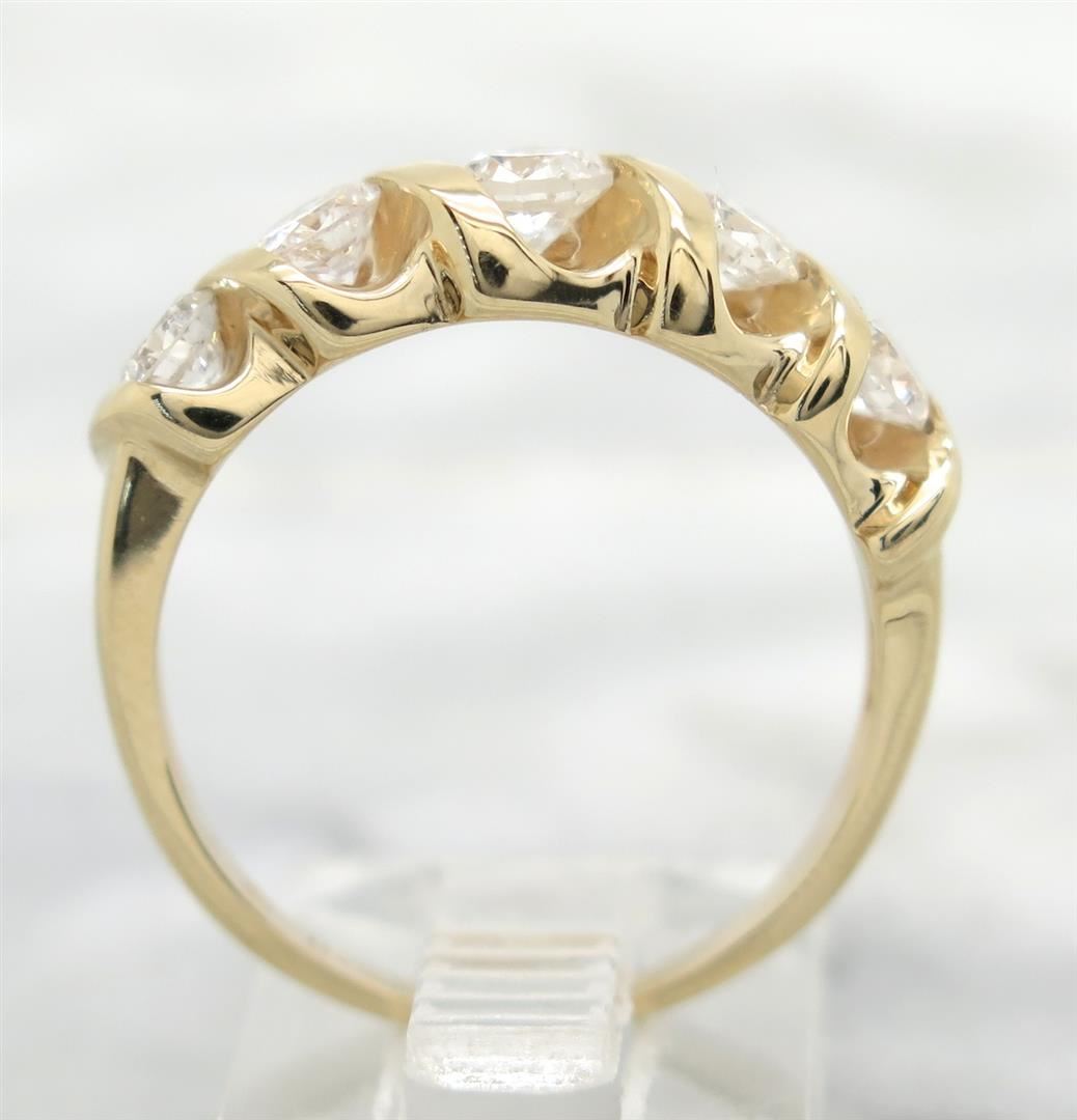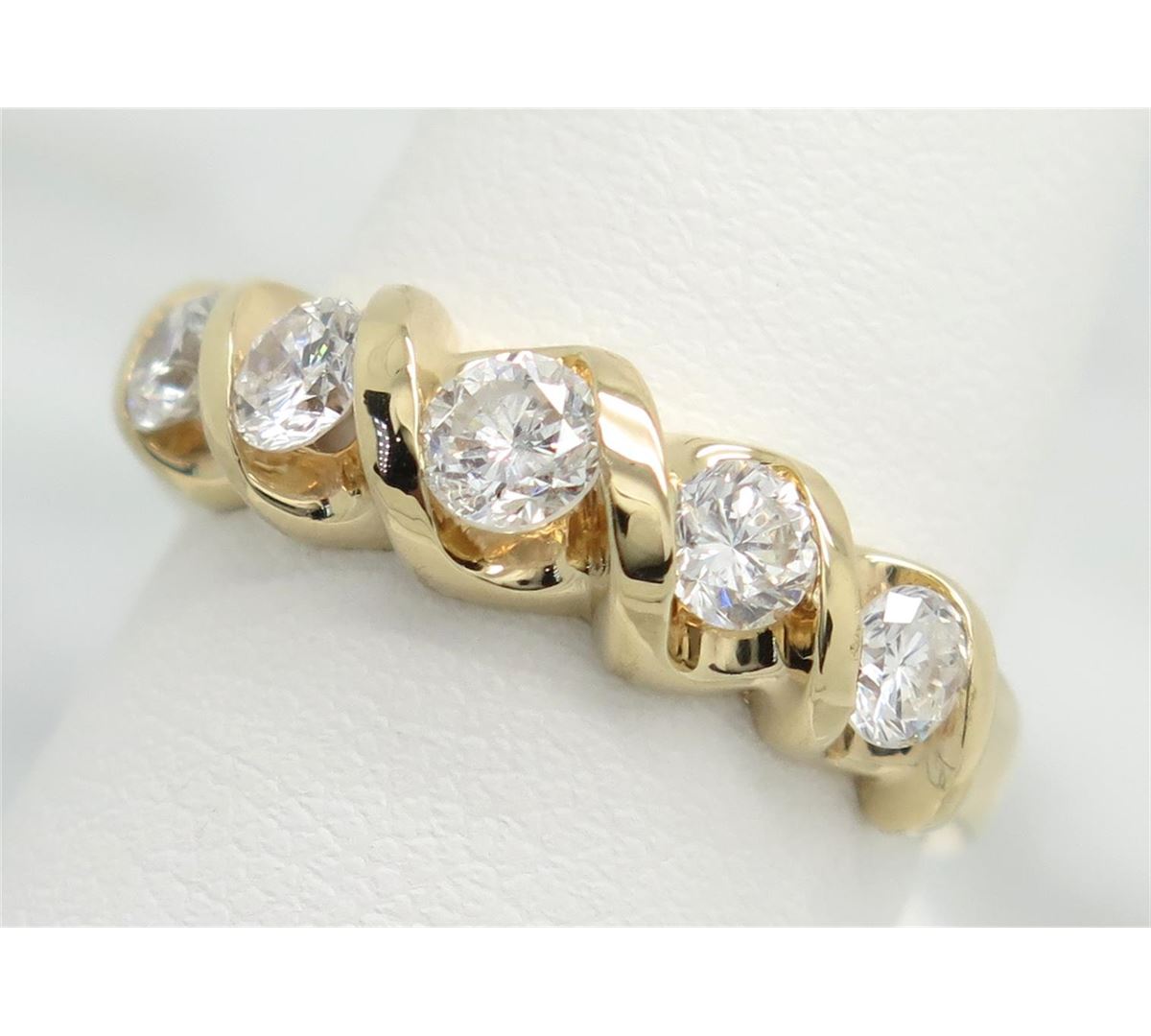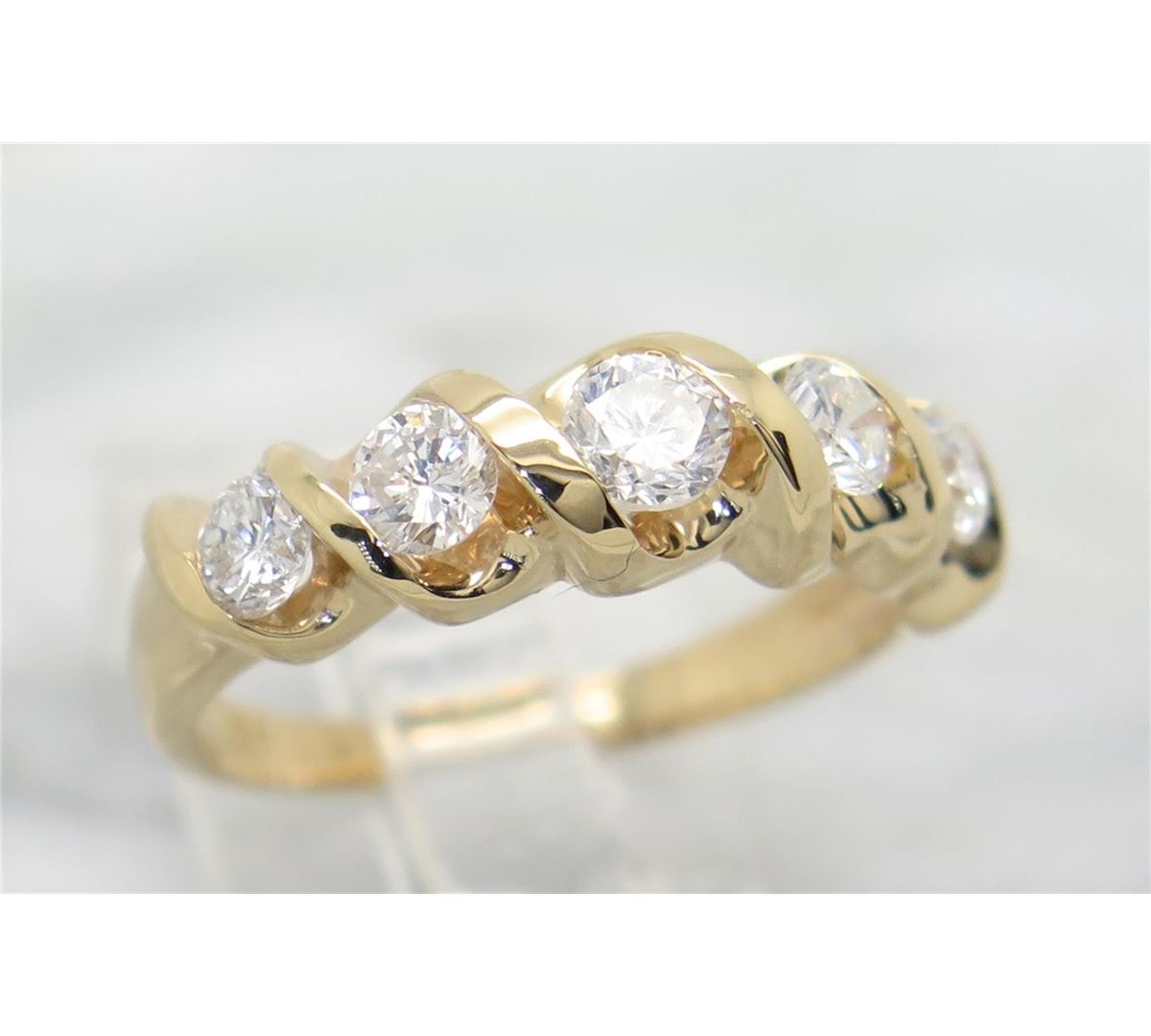 One tested 14K white gold diamond ring. Condition is new. Containing: Five Round Brilliant cut diamonds with F-H color, SI-I clarity. Approximate total diamond weight: .75CTW. Diamonds are graded in the mounting, unless otherwise stated. Weight: 4.0 grams. Size: 7.0