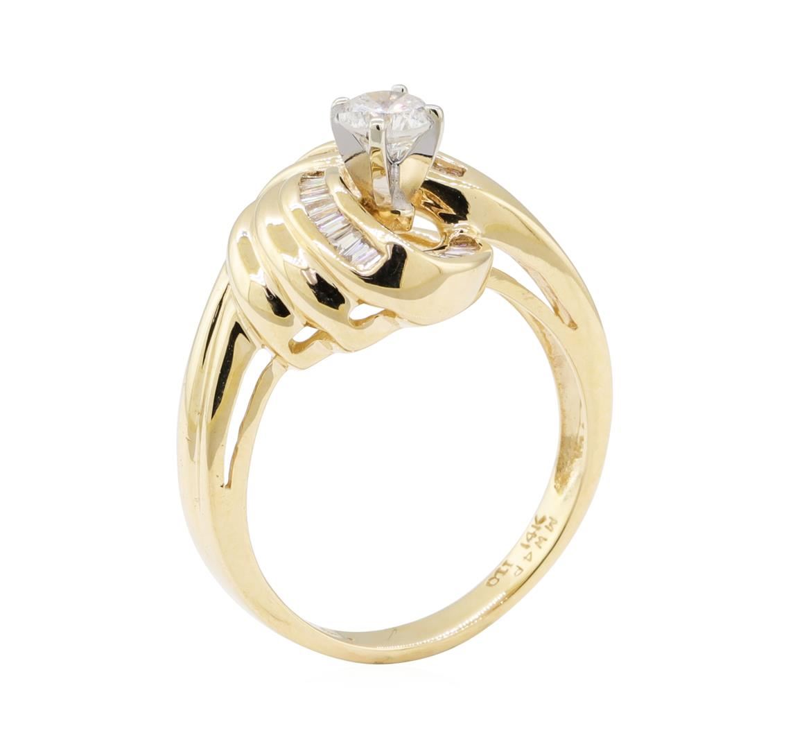 One ring with a bypass swirl motif featuring: 14KT yellow gold weighing 5.8 grams containing diamonds weighing 0.75ctw.