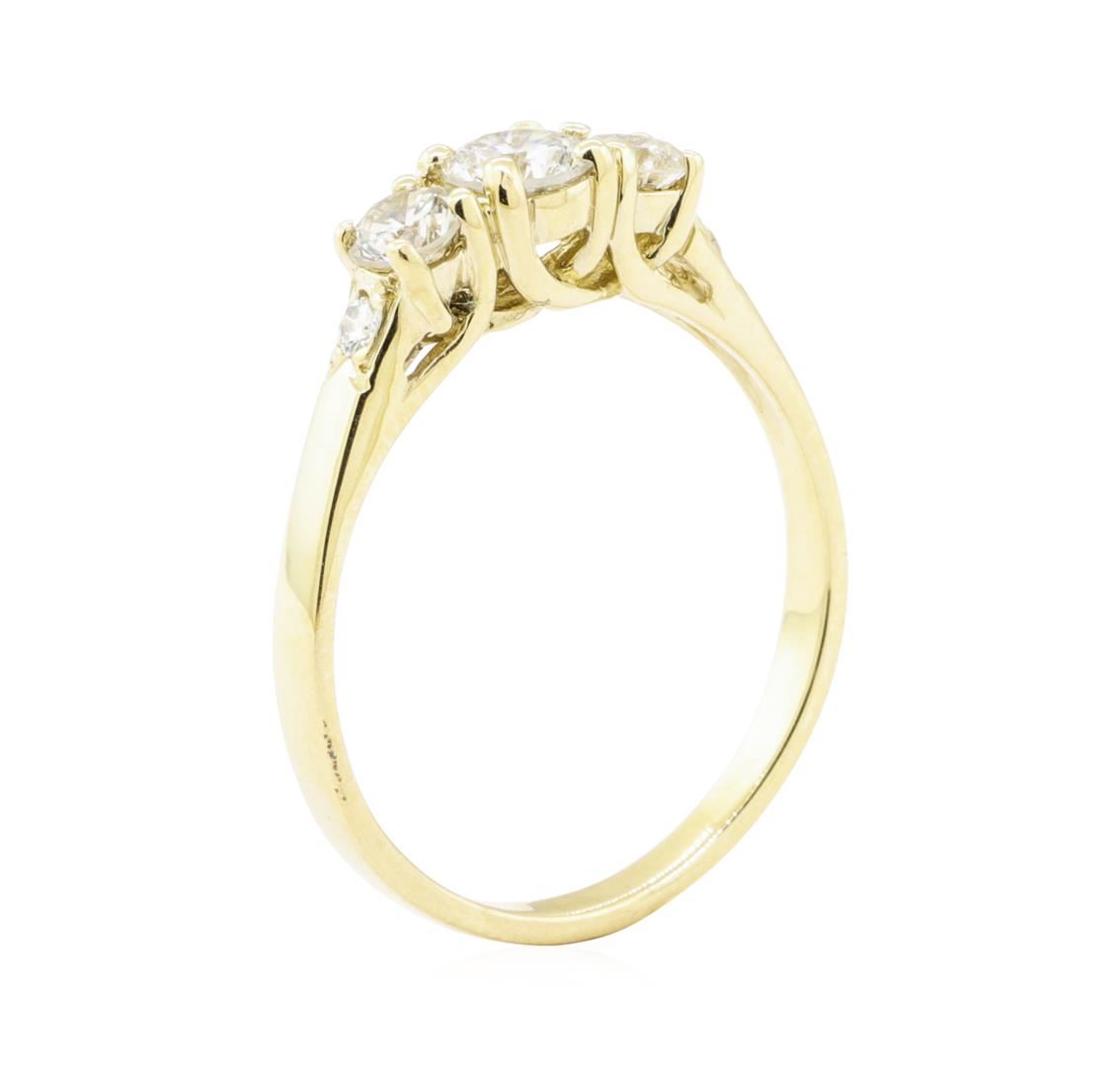 One electronically tested 14KT yellow gold lady's cast wedding ring with a three stone motif with a bright polish finish. The featured lady's ring has a shank measuring 2.10 millimeters wide. Identified with markings of '14K'. Condition is new, good workmanship. Containing: One prong set round brilliant cut diamond, measuring 4.50 - 4.44 x 2.77mm (depth est.) approximate weight of 0.34ct. Graded in the setting. Color H - I Clarity SI-2 Cut Good Two prong set round brilliant cut diamonds, measuring 3.61 - 3.55 x 2.22mm (depth est.) approximate total weight of 2 Stones = 0.35ct. Graded in the setting. Color I - J Clarity SI-1 to SI-2 Cut Good Two prong set round brilliant cut diamonds, measuring 2.10 - 2.00 x 1.27mm (depth est.) approximate total weight of 2 Stones = 0.06ct. Graded in the setting. Color H - I Clarity SI-1 to SI-2 Cut Very Good. Total Weight of Diamonds 0.75ct.. Total Weight of Ring 2.70gm GAS Appraised at $2660.00. GAS Appraised at $2,660.00.