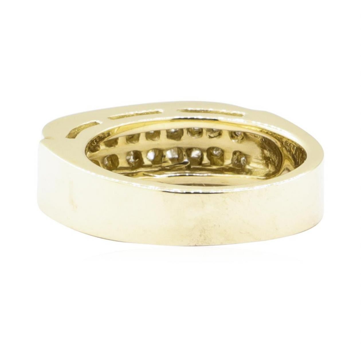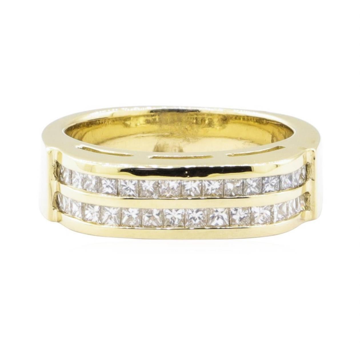 One electronically tested 14KT yellow gold lady's cast fashion ring with a two row channel with a bright polish finish. The featured lady's ring has should and a shank measuring 4.50 millimeters wide. Identified with markings of '14K'. Condition is new, good workmanship. Containing: Thirty-Two channel set princess cut diamonds, measuring 1.60 x 1.55 x 1.16mm (depth est.) approximate total weight of 32 Stones = 0.75ct. Graded in the setting. Color H - I Clarity VS-1 to SI-1 Cut Very Good. Total Weight of Diamonds 0.75ct.. Total Weight of Ring 8.00gm GAS Appraised at $3180.00. GAS Appraised.