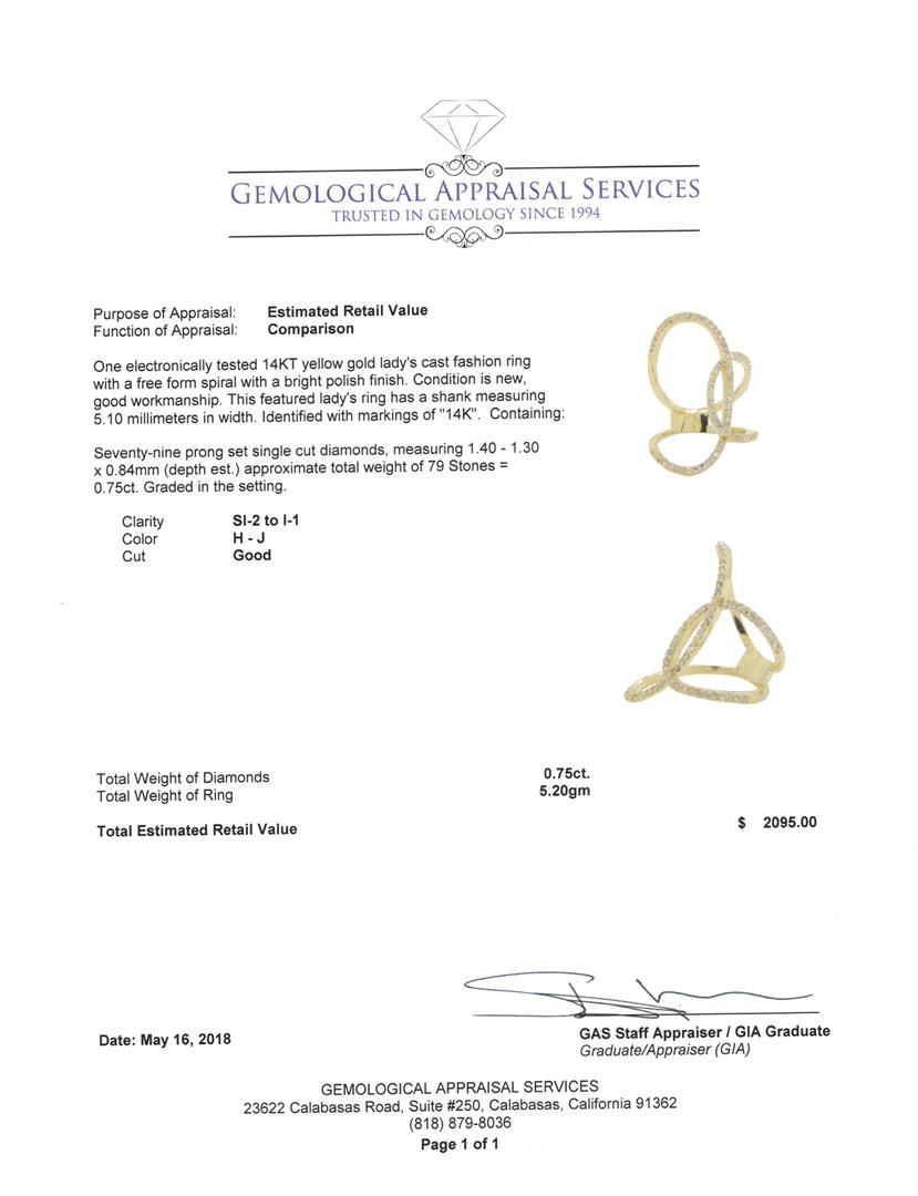 One electronically tested 14KT yellow gold lady's cast fashion ring with a free form spiral with a bright polish finish. This featured lady's ring has a shank measuring 5.10 millimeters in width. Identified with markings of '14K'. Condition is new, good workmanship. Containing: Seventy-Nine prong set single cut diamonds, measuring 1.40 - 1.30 x 0.84mm (depth est.) approximate total weight of 79 Stones = 0.75ct. Graded in the setting. Color H - J Clarity SI-2 to I-1 Cut Good. Total Weight of Diamonds 0.75ct.. Total Weight of Ring 5.20gm GAS Appraised at $2095.00. GAS Appraised.