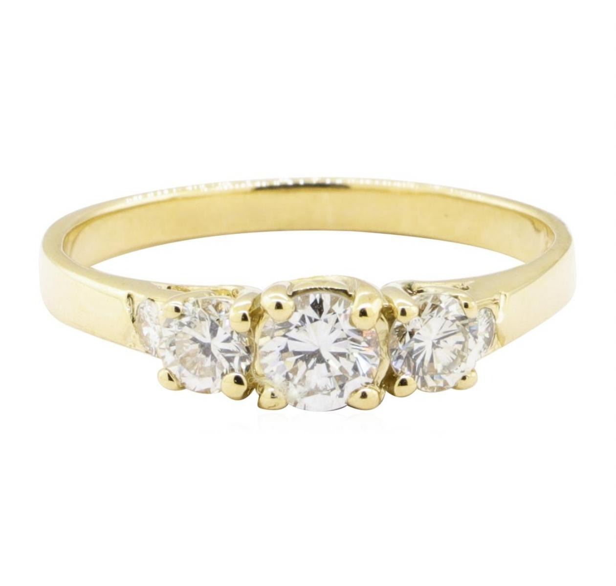 One electronically tested 14KT yellow gold lady's cast wedding ring with a three stone motif with a bright polish finish. The featured lady's ring has a shank measuring 2.10 millimeters wide. Identified with markings of '14K'. Condition is new, good workmanship. Containing: One prong set round brilliant cut diamond, measuring 4.50 - 4.44 x 2.77mm (depth est.) approximate weight of 0.34ct. Graded in the setting. Color H - I Clarity SI-2 Cut Good Two prong set round brilliant cut diamonds, measuring 3.61 - 3.55 x 2.22mm (depth est.) approximate total weight of 2 Stones = 0.35ct. Graded in the setting. Color I - J Clarity SI-1 to SI-2 Cut Good Two prong set round brilliant cut diamonds, measuring 2.10 - 2.00 x 1.27mm (depth est.) approximate total weight of 2 Stones = 0.06ct. Graded in the setting. Color H - I Clarity SI-1 to SI-2 Cut Very Good. Total Weight of Diamonds 0.75ct.. Total Weight of Ring 2.70gm GAS Appraised at $2660.00. GAS Appraised.