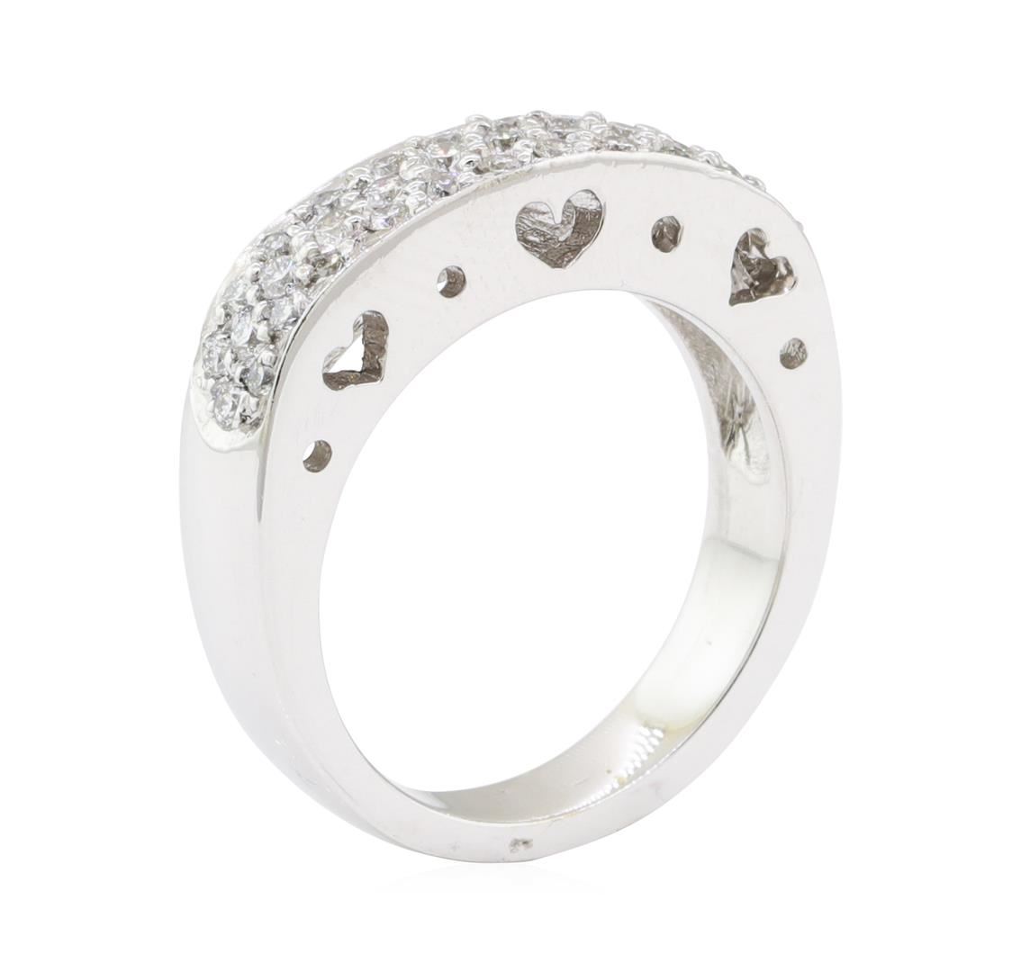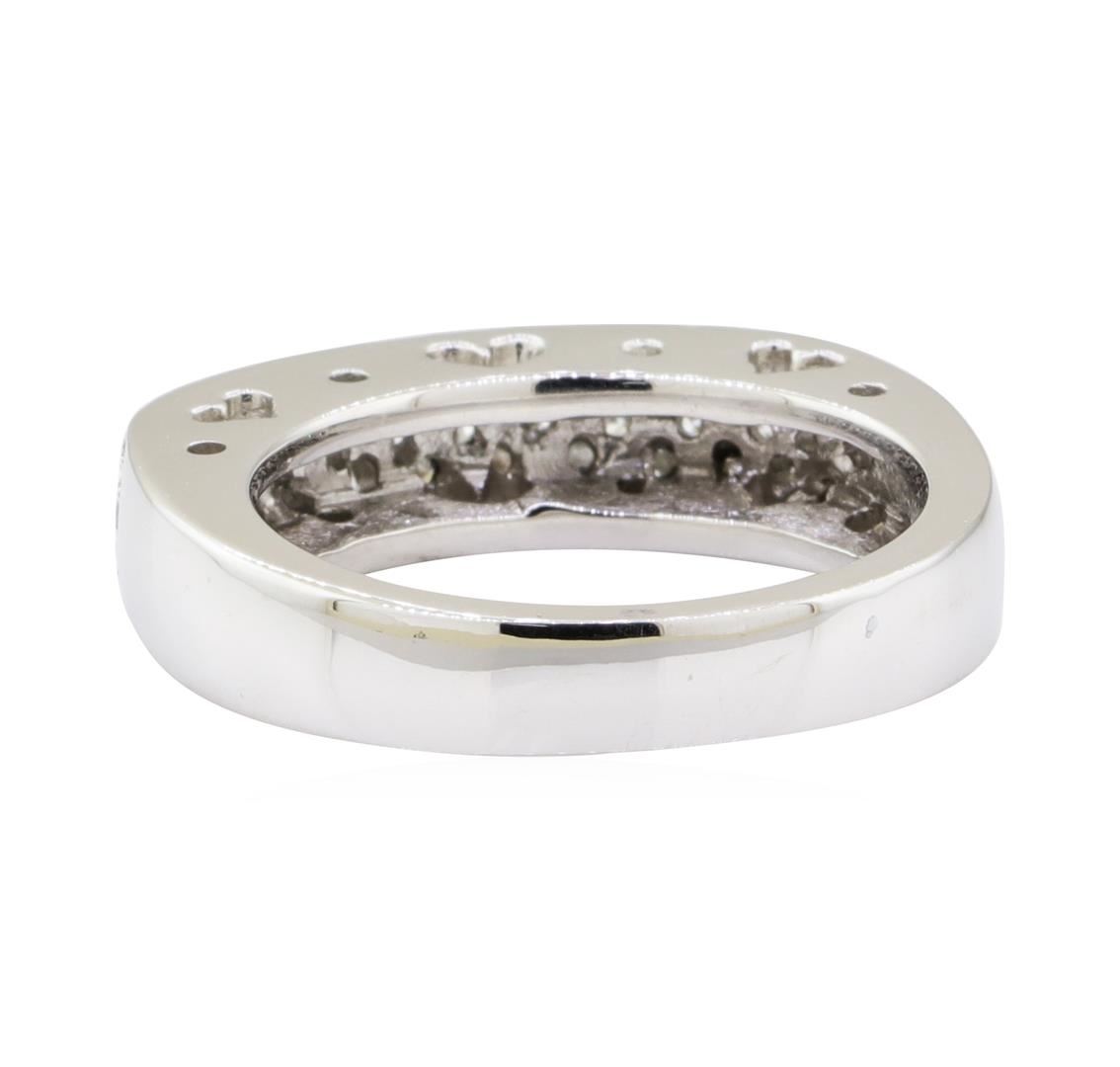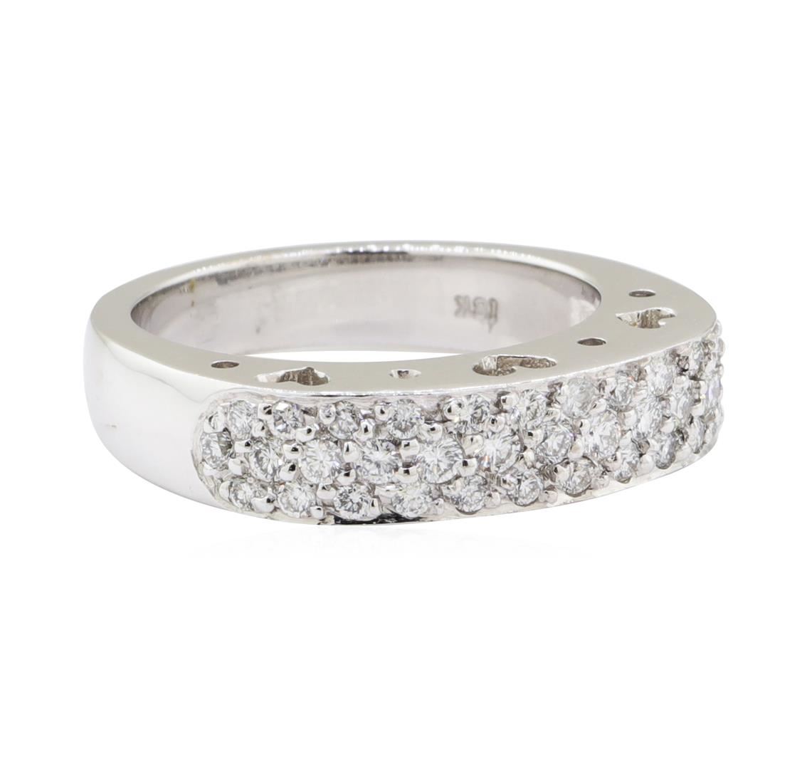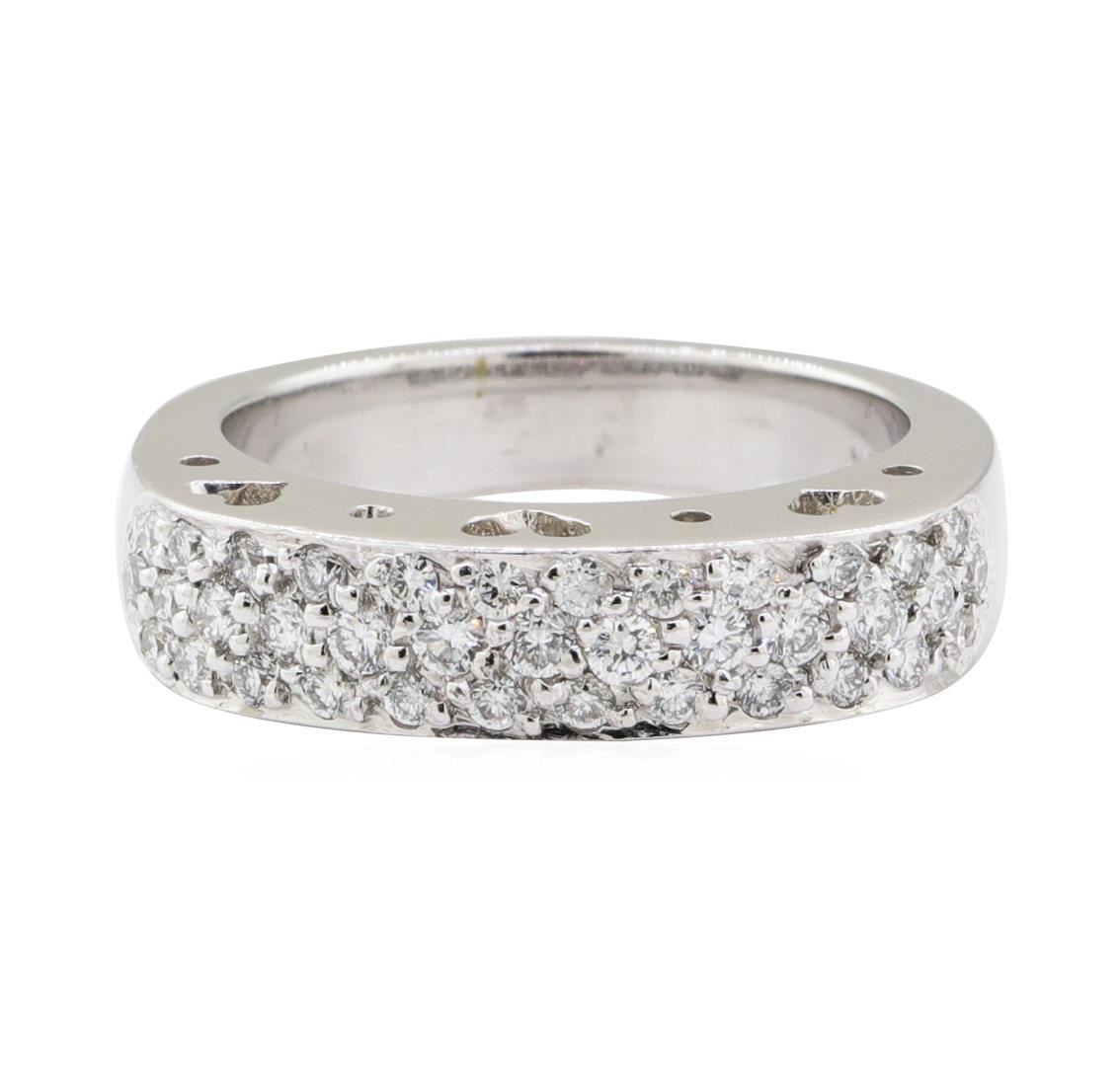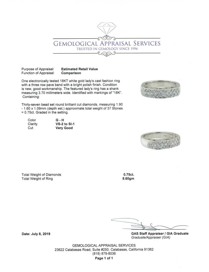 One electronically tested 18KT white gold lady's cast fashion ring with a three row pave band with a bright polish finish. The featured lady's ring has a shank measuring 3.70 millimeters wide. Identified with markings of '18K'. Condition is new, good workmanship. Containing: Thirty-Seven bead set round brilliant cut diamonds, measuring 1.90 - 1.60 x 1.09mm (depth est.) approximate total weight of 37 Stones = 0.75ct. Graded in the setting. Color G - H Clarity VS-2 to SI-1 Cut Very Good. Total Weight of Diamonds 0.75ct.. Total Weight of Ring 8.60gm GAS Appraised at $4070.00. GAS Appraised at $4,070.00.