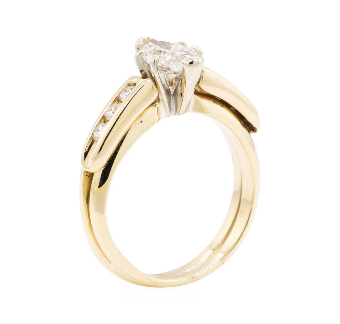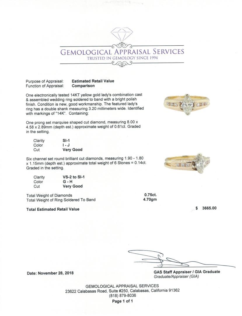 One electronically tested 14KT yellow gold lady's combination cast & assembled wedding ring soldered to band with a bright polish finish. The featured lady's ring has a double shank measuring 3.20 millimeters wide. Identified with markings of '14K'. Condition is new, good workmanship. Containing: One prong set marquise shaped cut diamond, measuring 8.00 x 4.58 x 2.89mm (depth est.) approximate weight of 0.61ct. Graded in the setting. Color I - J Clarity SI-1 Cut Very Good Six channel set round brilliant cut diamonds, measuring 1.90 - 1.80 x 1.15mm (depth est.) approximate total weight of 6 Stones = 0.14ct. Graded in the setting. Color G - H Clarity VS-2 to SI-1 Cut Very Good. Total Weight of Diamonds 0.75ct.. Total Weight of Ring Soldered To Band 4.70gm GAS Appraised at  $3665.00. GAS Appraised at $3,665.00.