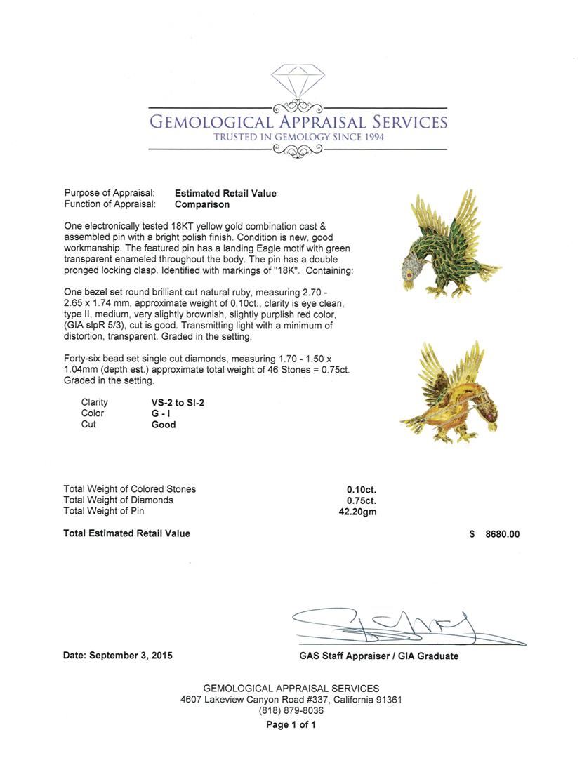 One electronically tested 18KT yellow gold combination cast & assembled pin with a bright polish finish. The featured pin has a landing Eagle motif with green transparent enameled throughout the body. The pin has a double pronged locking clasp. Identified with markings of "18K". Condition is new, good workmanship. Containing: One bezel set round brilliant cut natural ruby, measuring 2.70 - 2.65 x 1.74 mm, approximate weight of 0.10ct., clarity is eye clean, type II, medium, very slightly brownish, slightly purplish red color, (GIA slpR 5/3), cut is good. Transmitting light with a minimum of distortion, transparent. Graded in the setting. Forty-Six bead set single cut diamonds, measuring 1.70 - 1.50 x 1.04mm (depth est.) approximate total weight of 46 Stones = 0.75ct. Graded in the setting. Clarity: VS-2 to SI-2. Color: G - I. Cut Good. Total Weight of Colored Stones 0.10ct. Total Weight of Diamonds 0.75ct. Total Weight of Pin 42.20gm. GAS Appraised at $8,680.00.