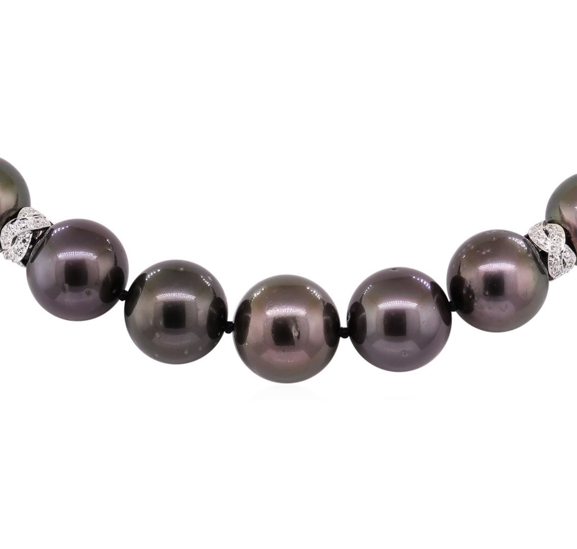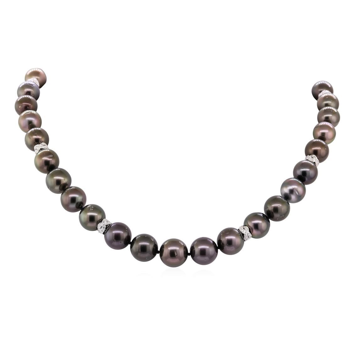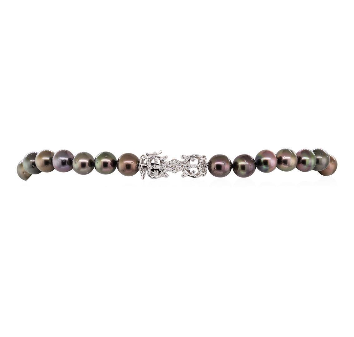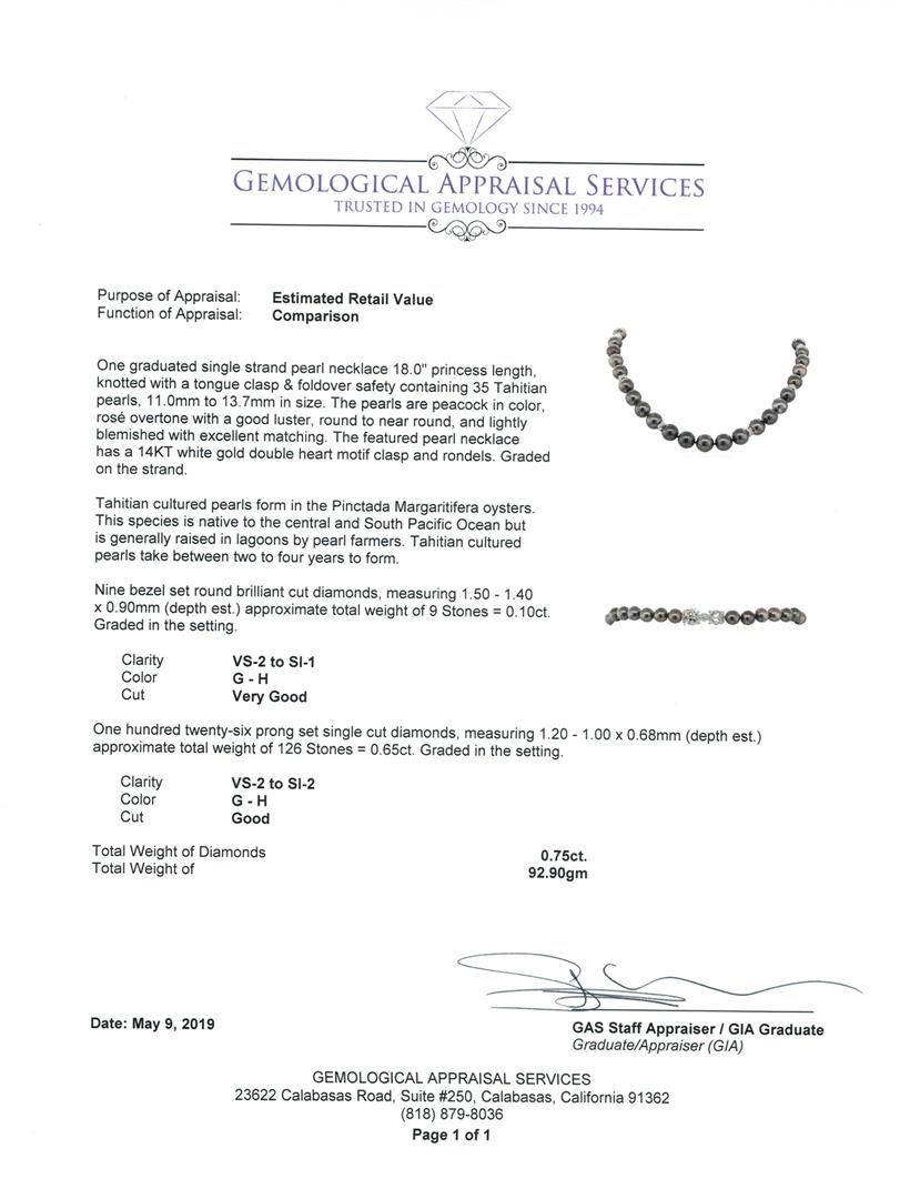 One graduated single strand pearl necklace 18.0' princess length, knotted with a tongue clasp & foldover safety containing 35 Tahitian pearls, 11.0mm to 13.7mm in size. The pearls are peacock in color, ros� overtone with a good luster, round to near round, and lightly blemished with excellent matching. The featured pearl necklace has a 14KT white gold double heart motif clasp and rondels. Graded on the strand.Tahitian cultured pearls form in the Pinctada Margaritifera oysters. This species is native to the central and South Pacific Ocean but is generally raised in lagoons by pearl farmers. Tahitian cultured pearls take between two to four years to form. Nine bezel set round brilliant cut diamonds, measuring 1.50 - 1.40 x 0.90mm (depth est.) approximate total weight of 9 Stones = 0.10ct. Graded in the setting. Color G - H Clarity VS-2 to SI-1 Cut Very Good One Hundred Twenty-Six prong set single cut diamonds, measuring 1.20 - 1.00 x 0.68mm (depth est.) approximate total weight of 126 Stones = 0.65ct. Graded in the setting. Color G - H Clarity VS-2 to SI-2 Cut Good. Total Weight of Diamonds 0.75ct.. Total Weight of 92.90gm GAS Appraised at $20250.00. GAS Appraised at $20,250.00.