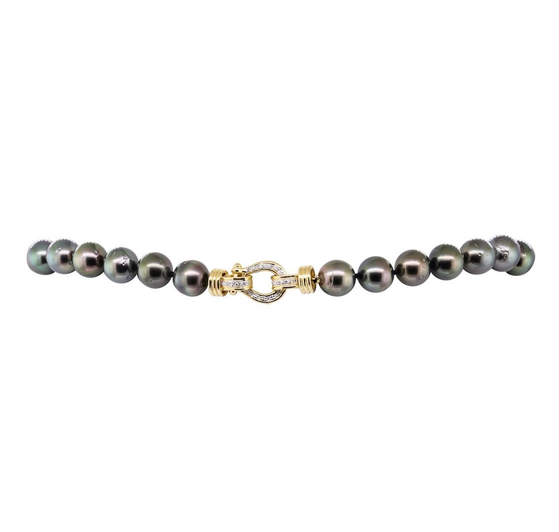 One graduated single strand pearl necklace 18.0' princess length, knotted with a foldover buckle clasp containing 35 Tahitian pearls, 11.0mm to 13.5mm in size. The pearls are black in color, green overtone with a very good luster, round to near round, and mostly clean with very good matching. The featured pearl necklace has a 14KT yellow gold buckle clasp and rondels. Graded on the strand.Tahitian cultured pearls form in the Pinctada Margaritifera oysters. This species is native to the central and South Pacific Ocean but is generally raised in lagoons by pearl farmers. Tahitian cultured pearls take between two to four years to form. Ninety-Four prong set single cut diamonds, measuring 1.30 - 1.25 x 0.79mm (depth est.) approximate total weight of 94 Stones = 0.75ct. Graded in the setting. Color G - H Clarity VS-2 to SI-2 Cut Good. Total Weight of Diamonds 0.75ct.. Total Weight of 97.40gm GAS Appraised at $19165.00. GAS Appraised at $19,165.00.