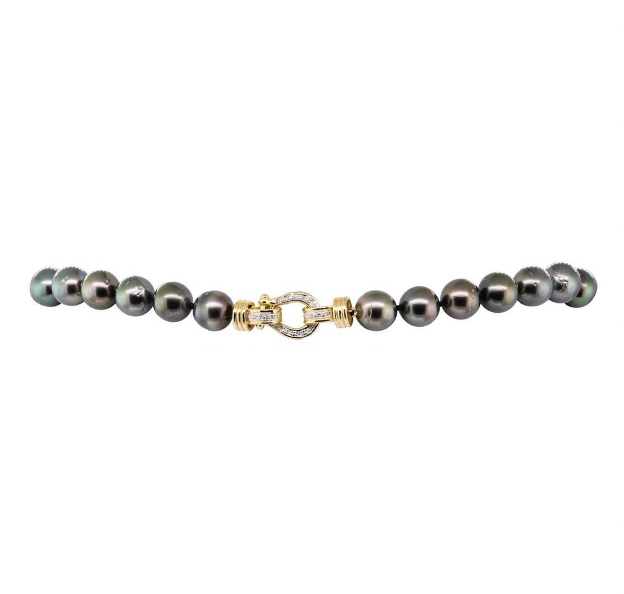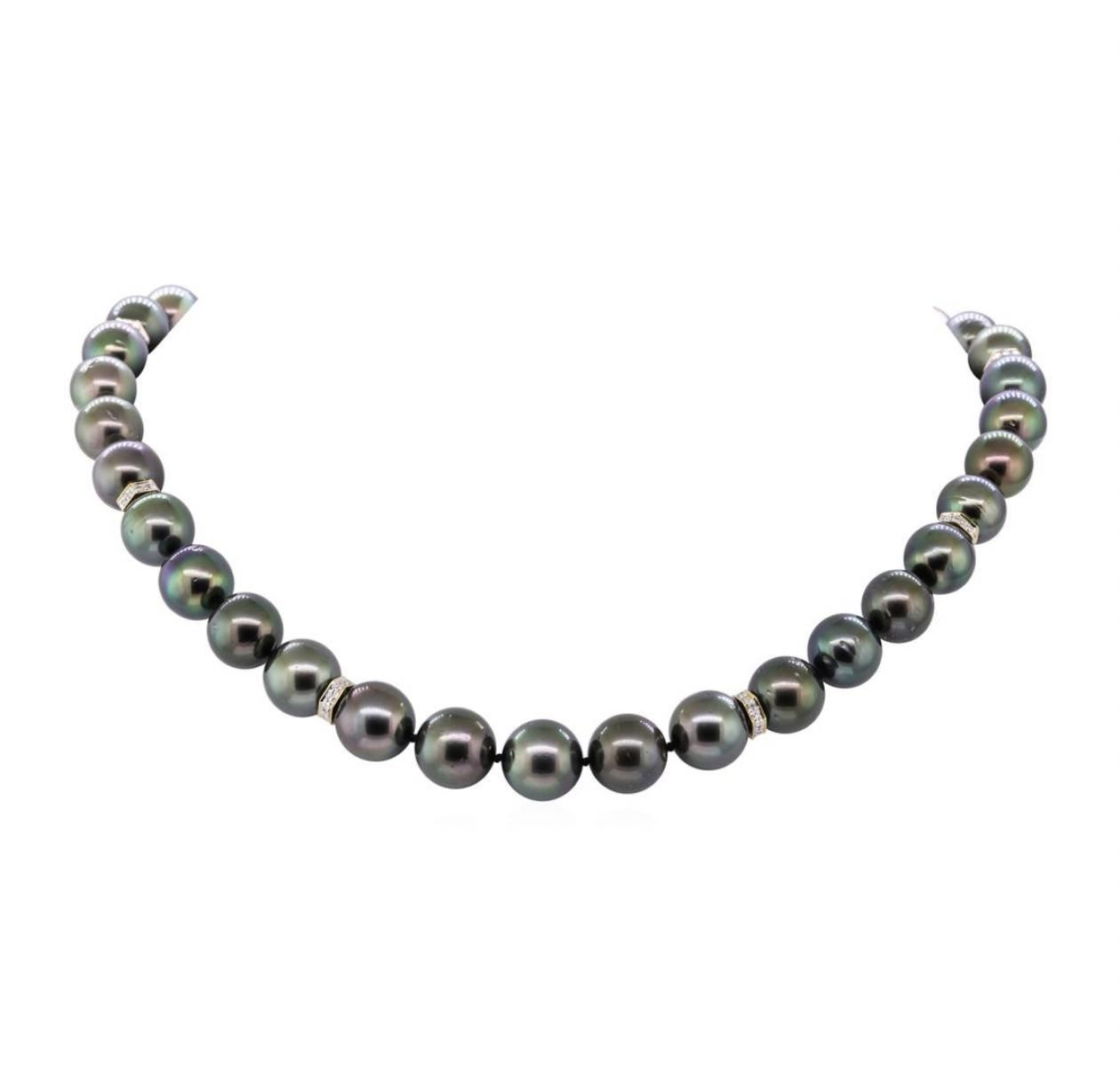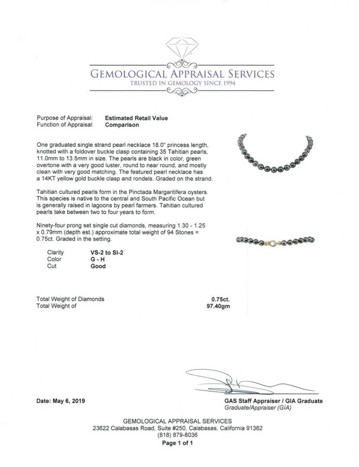 One graduated single strand pearl necklace 18.0' princess length, knotted with a foldover buckle clasp containing 35 Tahitian pearls, 11.0mm to 13.5mm in size. The pearls are black in color, green overtone with a very good luster, round to near round, and mostly clean with very good matching. The featured pearl necklace has a 14KT yellow gold buckle clasp and rondels. Graded on the strand.Tahitian cultured pearls form in the Pinctada Margaritifera oysters. This species is native to the central and South Pacific Ocean but is generally raised in lagoons by pearl farmers. Tahitian cultured pearls take between two to four years to form. Ninety-Four prong set single cut diamonds, measuring 1.30 - 1.25 x 0.79mm (depth est.) approximate total weight of 94 Stones = 0.75ct. Graded in the setting. Color G - H Clarity VS-2 to SI-2 Cut Good. Total Weight of Diamonds 0.75ct.. Total Weight of 97.40gm GAS Appraised at $19165.00. GAS Appraised.
