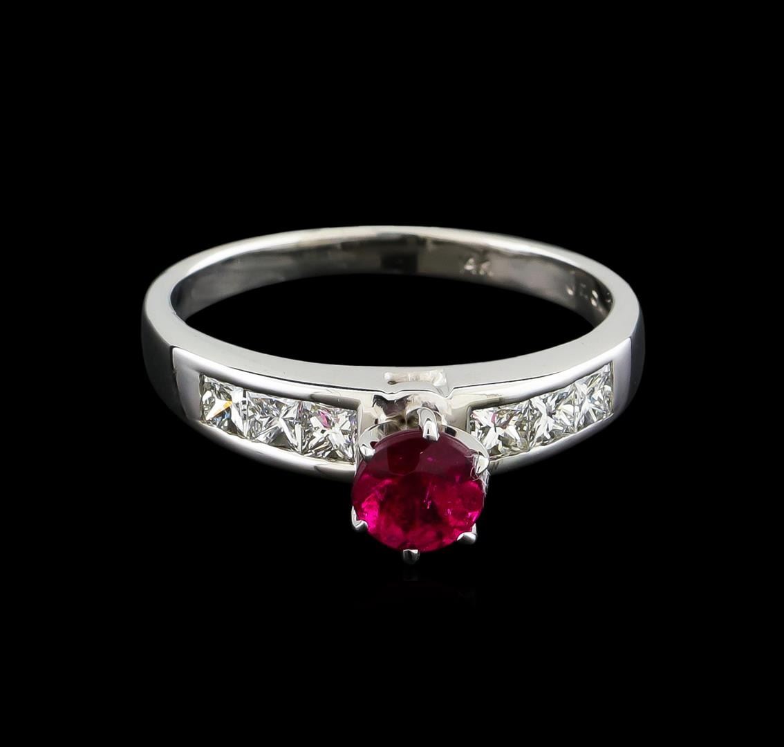 One 14KT white gold ring weighing 5.29 grams. Containing: One round shape pink tourmaline with a total weight of 0.75ct. The pink tourmaline has a clarity of good deep color. The ring also contains six princess cut natural diamonds with a total weight of