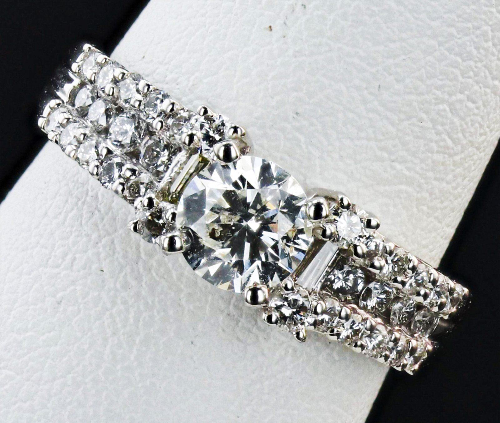 Lady's Diamond Ring Setting: Platinum Mounting [5.80 gms] Cut: Round Brilliant Color: H Clarity: I1 Measurements: 5.68 - 5.70 x 3.70mm Approximate Weight: 0.75 Carat Additional Stones/Information: 28 RoundBrilliant and 2 Baguette Cut Diamonds = Approx. 0.62 Cts. TWT (Color: H-I, Clarity: SI-I1)