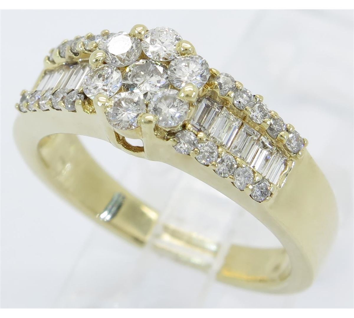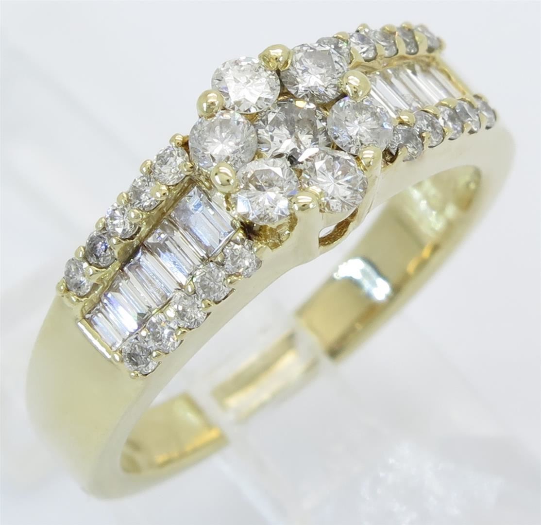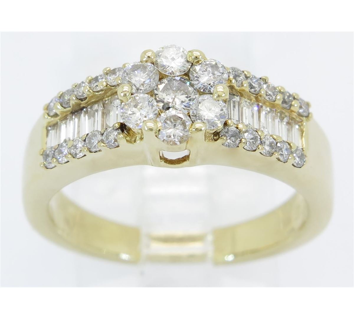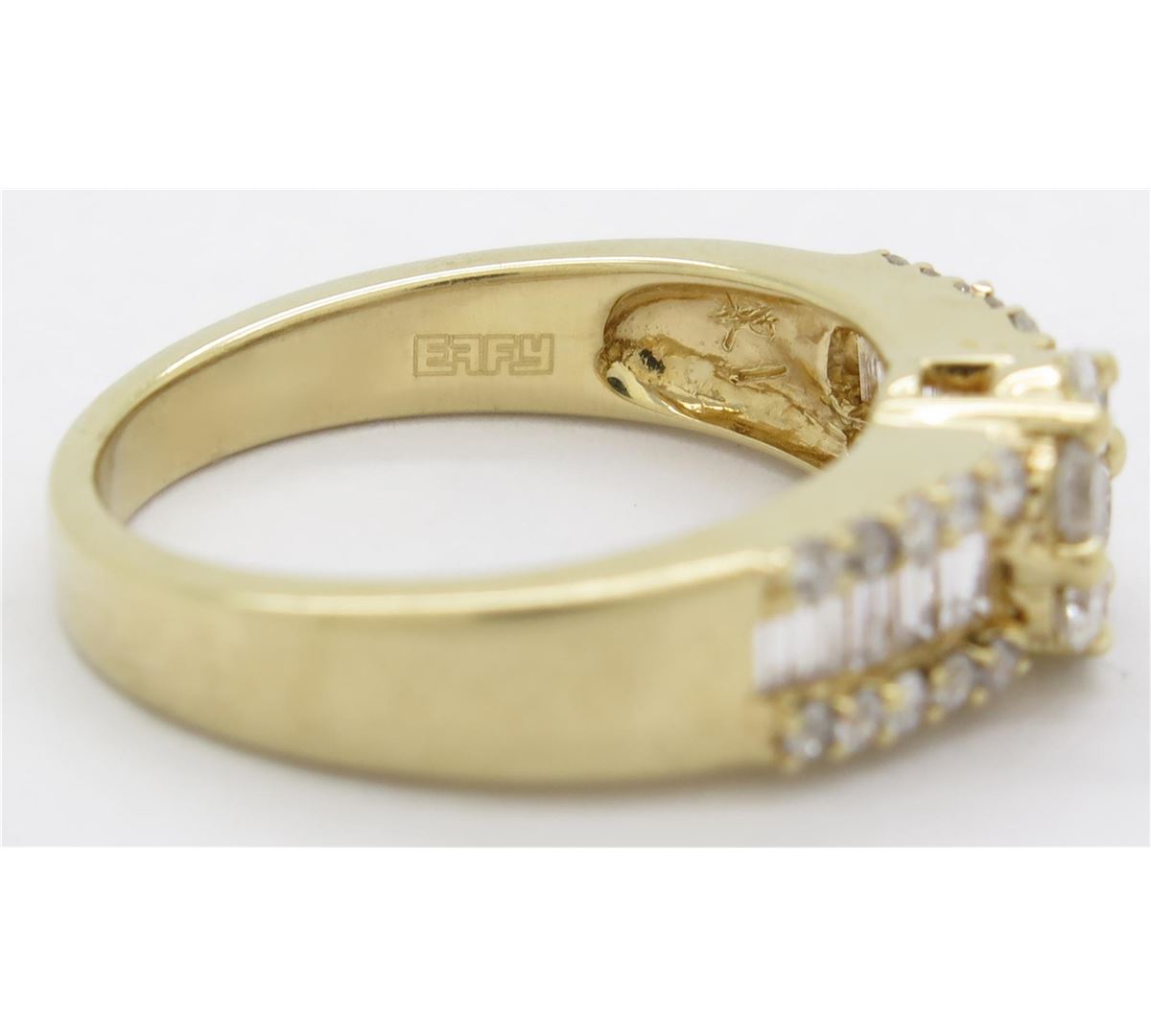 One tested 14K yellow gold designer Effy diamond ring. Condition is new. Containing: Twenty seven Round Brilliant cut diamonds, and ten Baguette cut diamonds. Color: G-H, Clarity: I. Approximate total diamond weight: .75CTW. Diamonds are graded in the mounting, unless otherwise stated. Weight: 5.2 grams. Size: 7.0