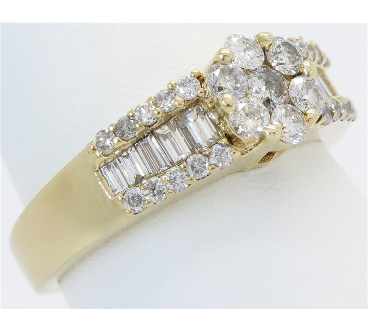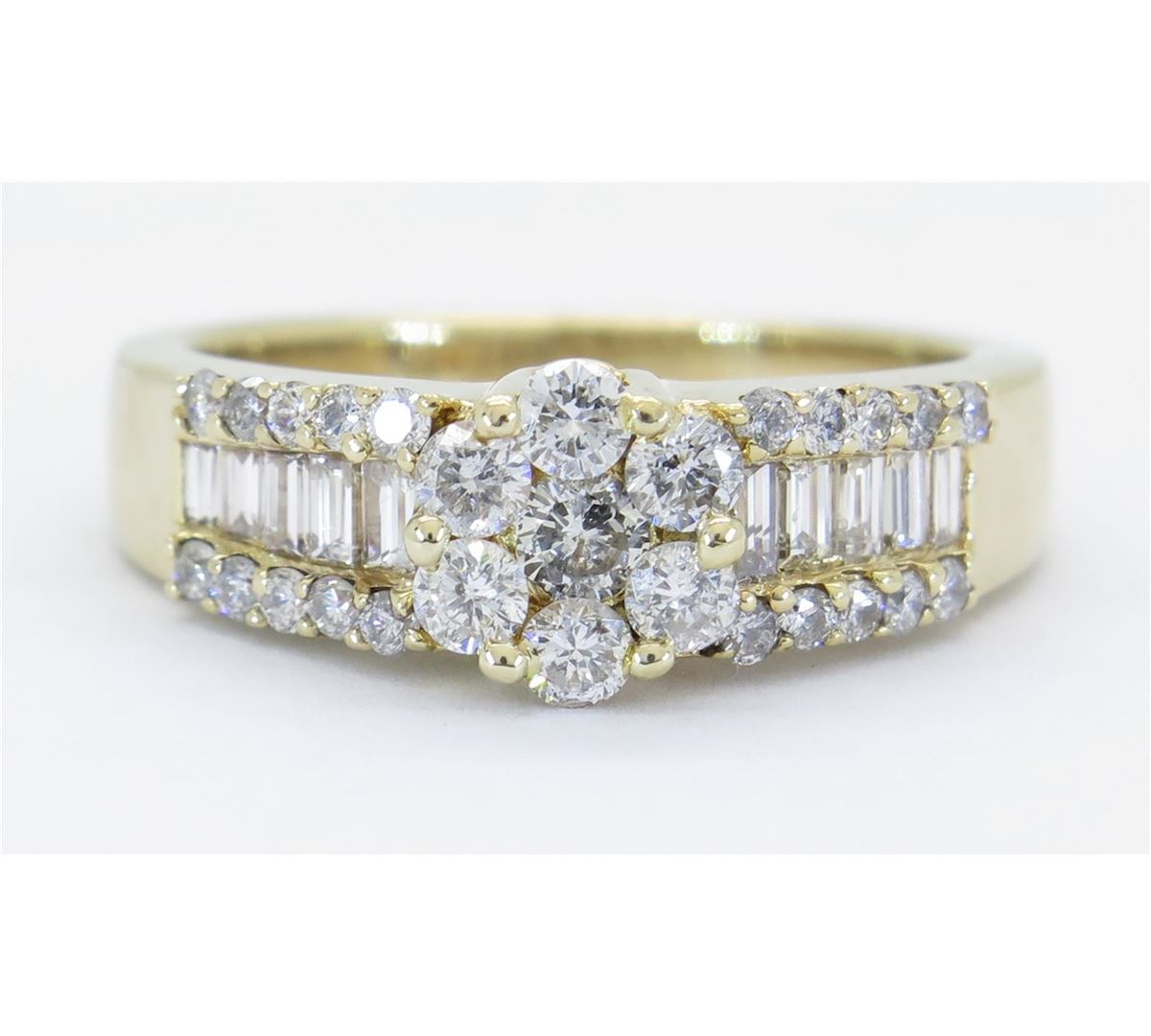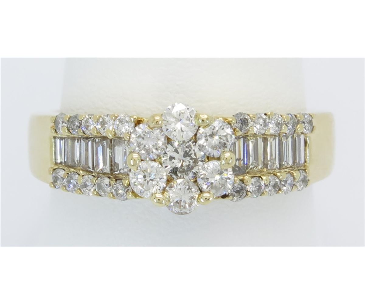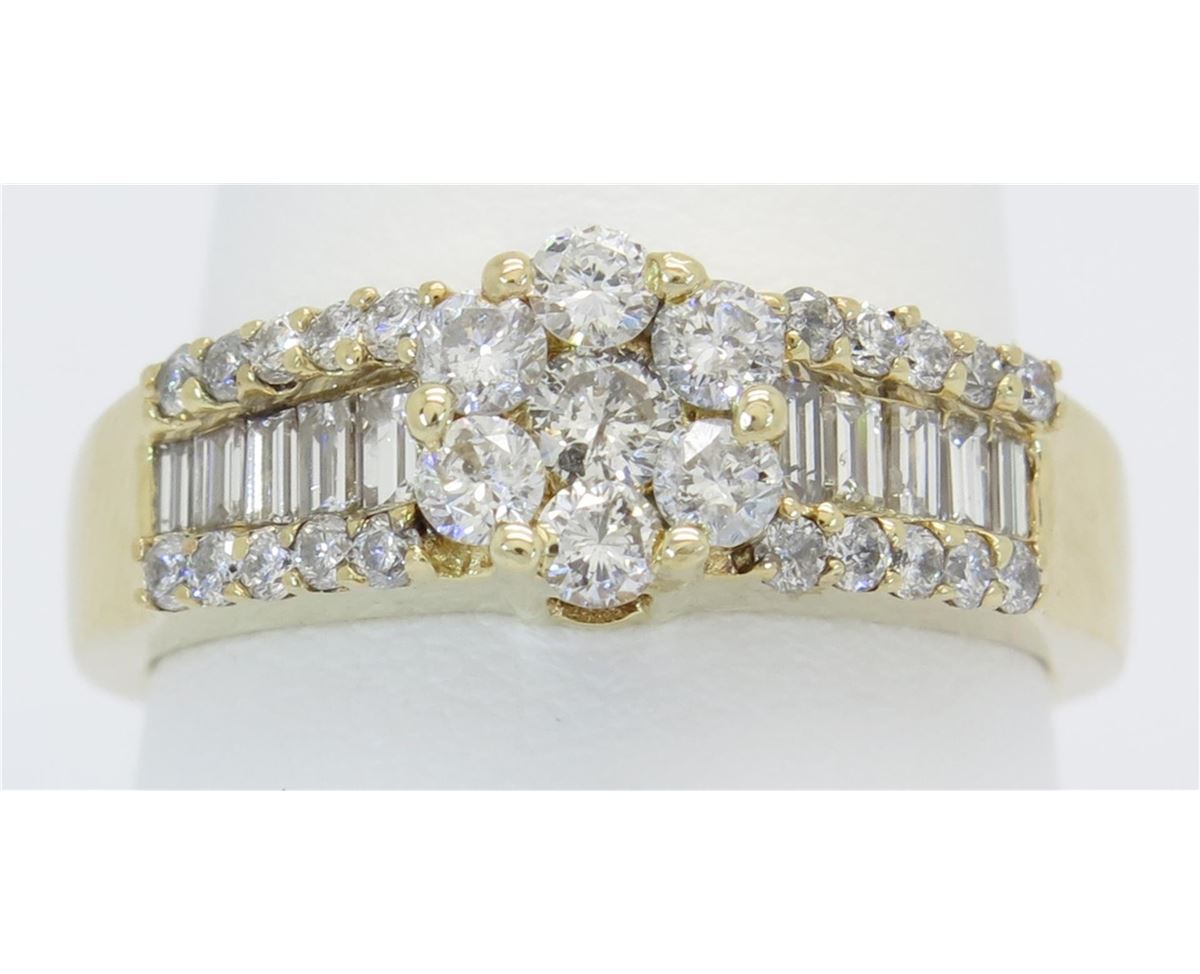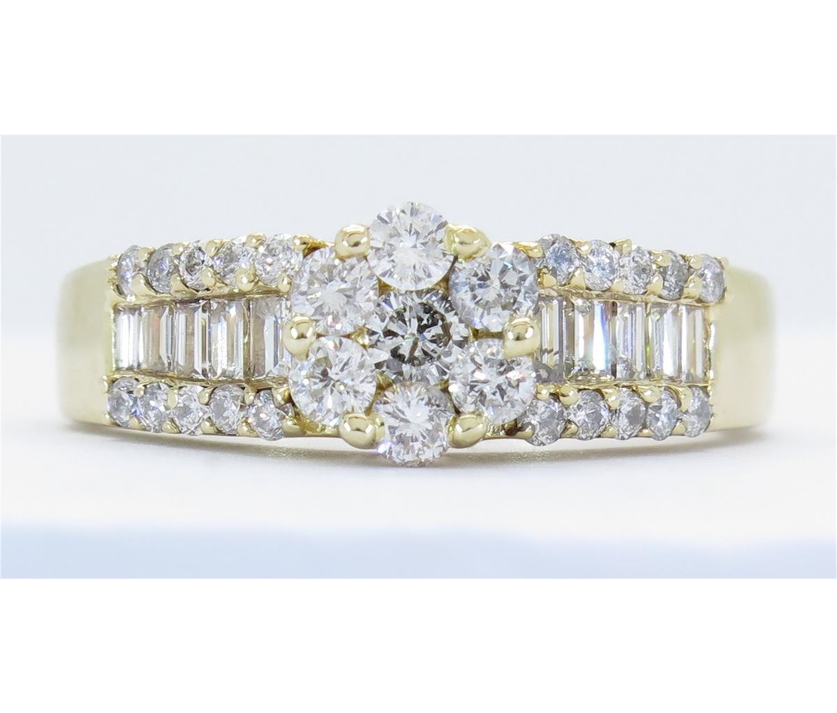 One tested 14K yellow gold designer Effy diamond ring. Condition is new. Containing: Twenty seven Round Brilliant cut diamonds, and ten Baguette cut diamonds. Color: G-H, Clarity: I. Approximate total diamond weight: .75CTW. Diamonds are graded in the mounting, unless otherwise stated. Weight: 5.2 grams. Size: 7.0