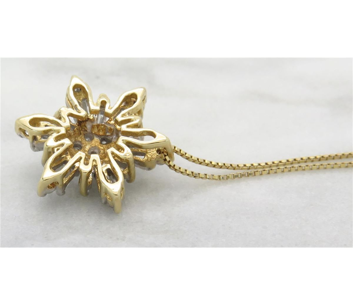 One tested 14K yellow gold diamond pendant. Containing: 13 Round Brilliant Cut Diamonds, 18 Baguette Cut Diamonds. Clarity: I, Color: G-I. Approximate total diamond weight: 3/4CTW. Diamonds are graded in the mounting, unless otherwise stated. Weight: 4.0 grams, Size of chain: 18.5" long.