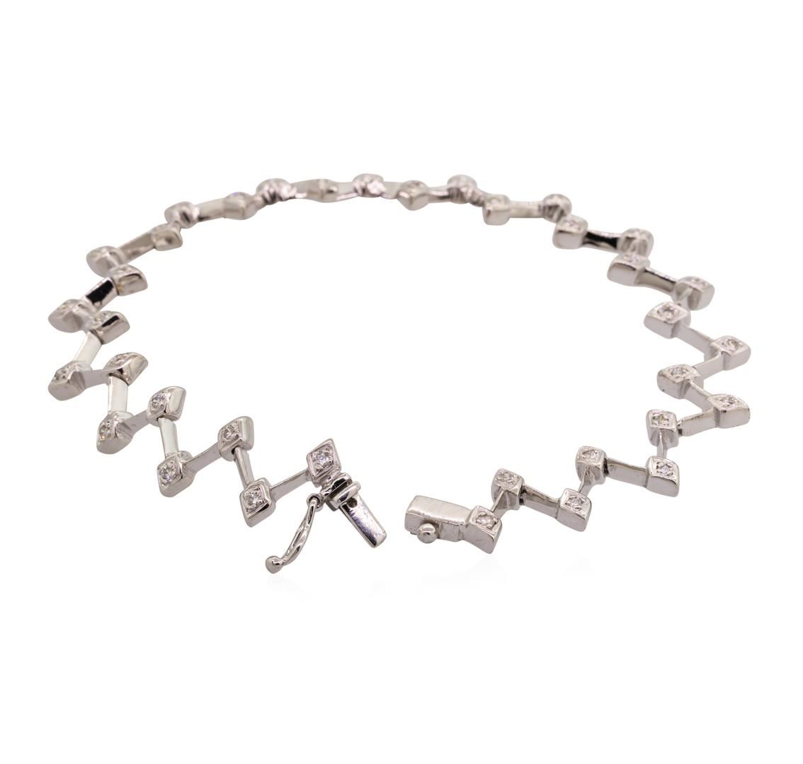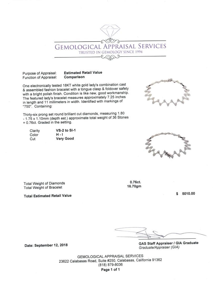 One electronically tested 18KT white gold lady's combination cast & assembled fashion bracelet with a tongue clasp & foldover safety with a bright polish finish. The featured lady's bracelet measures approximately 7.25 inches in length and 11 millimeters in width. Identified with markings of '750'. Condition is like new, good workmanship. Containing: Thirty-Six prong set round brilliant cut diamonds, measuring 1.80 - 1.75 x 1.10mm (depth est.) approximate total weight of 36 Stones = 0.76ct. Graded in the setting. Color H - I Clarity VS-2 to SI-1 Cut Very Good. Total Weight of Diamonds 0.76ct.. Total Weight of Bracelet 16.70gm GAS Appraised at $5010.00. GAS Appraised at $5,010.00.