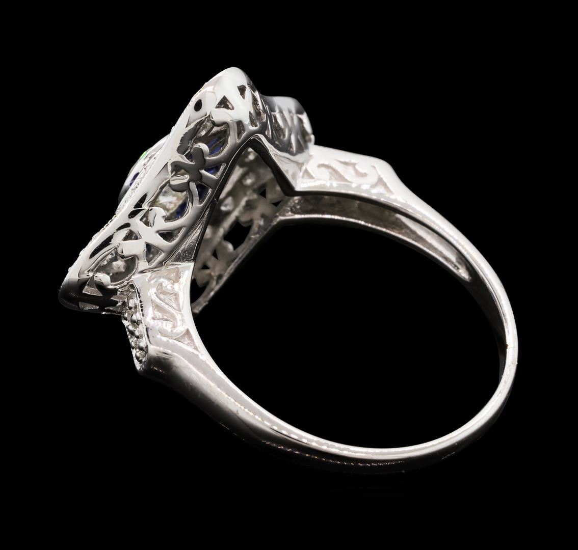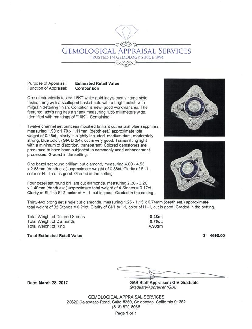 One electronically tested 18KT white gold lady's cast vintage style fashion ring with a scalloped basket halo with a bright polish with milgrain detailing finish. The featured lady's ring has a shank measuring 1.56 millimeters wide. Identified with markin GAS Appraised at $4,695.00.
