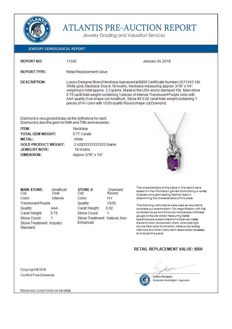 REF-11A8X -11343 ---- 0.77 CTW Amethyst & Diamond Necklace 10K White Gold ---- Luxury Designer Brand Necklace Appraised at $800 Certificate Number US11343 10k White gold, Necklace Size is 16 Incehs, Necklace measuring approx. 3/16" x 1/4", weighing in total approx. 2.3 grams. Made in the USA and is stamped 10k, Main stone 0.75 carat total weight containing 1 pieces of Intense Translucent Purple color with AAA quality Oval shape cut Amethyst , Stone #2 0.02 carat total weight containing 1 pieces of H-I color with VS/SI quality Round shape cut Diamond