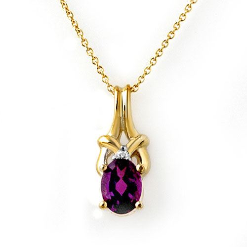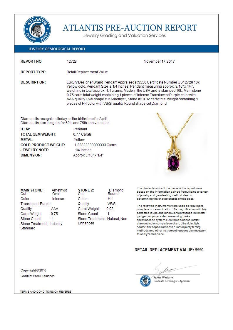 REF-9X3T -12728 ---- 0.77 CTW Amethyst & Diamond Pendant 10K Yellow Gold ---- Luxury Designer Brand Pendant Appraised at $550 Certificate Number US12728 10k Yellow gold, Pendant Size is 1/4 Inches, Pendant measuring approx. 3/16" x 1/4", weighing in total approx. 1.1 grams. Made in the USA and is stamped 10k, Main stone 0.75 carat total weight containing 1 pieces of Intense Translucent Purple color with AAA quality Oval shape cut Amethyst , Stone #2 0.02 carat total weight containing 1 pieces of H-I color with VS/SI quality Round shape cut Diamond