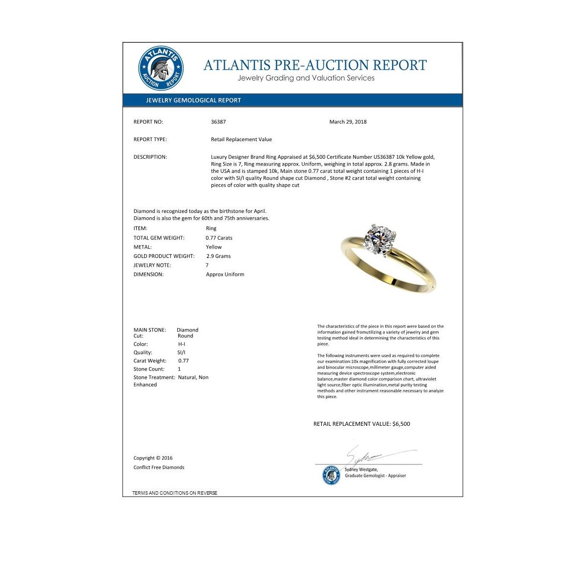 REF-118A2X -36387 ---- 0.77 CTW Certified H-SI/I Quality Diamond Solitaire Engagement Ring 10K Yellow Gold ---- Luxury Designer Brand Ring Appraised at $6,500 Certificate Number US36387 10k Yellow gold, Ring Size is 7, Ring measuring approx. Uniform, weighing in total approx. 2.8 grams. Made in the USA and is stamped 10k, Main stone 0.77 carat total weight containing 1 pieces of H-I color with SI/I quality Round shape cut Diamond , Stone #2 carat total weight containing pieces of color with quality shape cut