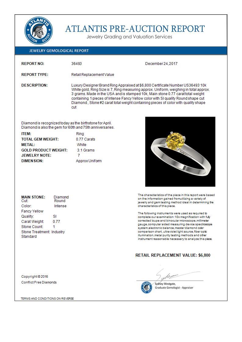 REF-92X5T -36493 ---- 0.77 CTW Certified Intense Yellow SI Diamond Solitaire Engagement Ring 10K White Gold ---- Luxury Designer Brand Ring Appraised at $6,800 Certificate Number US36493 10k White gold, Ring Size is 7, Ring measuring approx. Uniform, weighing in total approx. 3 grams. Made in the USA and is stamped 10k, Main stone 0.77 carat total weight containing 1 pieces of Intense Fancy Yellow color with SI quality Round shape cut Diamond , Stone #2 carat total weight containing pieces of color with quality shape cut
