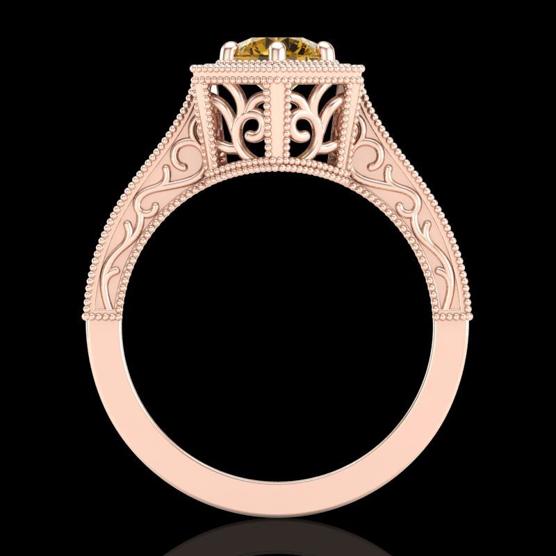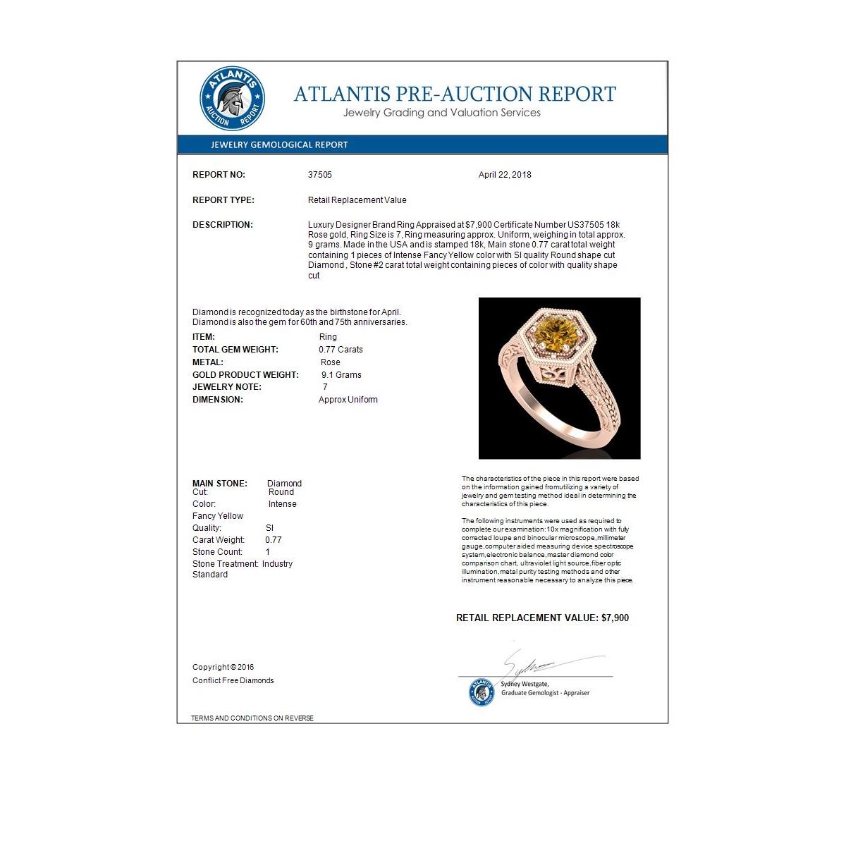 REF-130M9H -37505 ---- 0.77 CTW Intense Fancy Yellow Diamond Engagement Art Deco Ring 18K Rose Gold ---- Luxury Designer Brand Ring Appraised at $7,900 Certificate Number US37505 18k Rose gold, Ring Size is 7, Ring measuring approx. Uniform, weighing in total approx. 9 grams. Made in the USA and is stamped 18k, Main stone 0.77 carat total weight containing 1 pieces of Intense Fancy Yellow color with SI quality Round shape cut Diamond , Stone #2 carat total weight containing pieces of color with quality shape cut