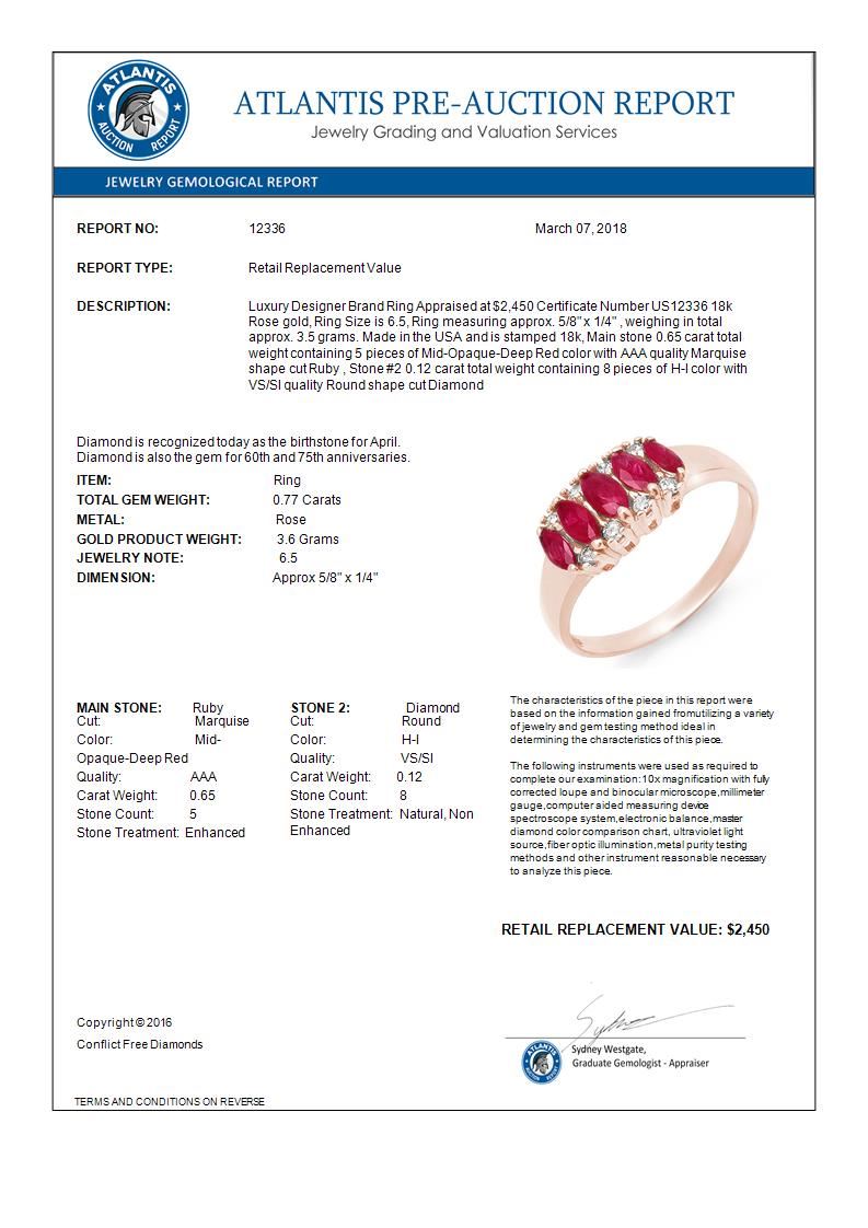 REF-37X3T -12336 ---- 0.77 CTW Ruby & Diamond Ring 18K Rose Gold ---- Luxury Designer Brand Ring Appraised at $2,450 Certificate Number US12336 18k Rose gold, Ring Size is 6.5, Ring measuring approx. 5/8" x 1/4" , weighing in total approx. 3.5 grams. Made in the USA and is stamped 18k, Main stone 0.65 carat total weight containing 5 pieces of Mid-Opaque-Deep Red color with AAA quality Marquise shape cut Ruby , Stone #2 0.12 carat total weight containing 8 pieces of H-I color with VS/SI quality Round shape cut Diamond