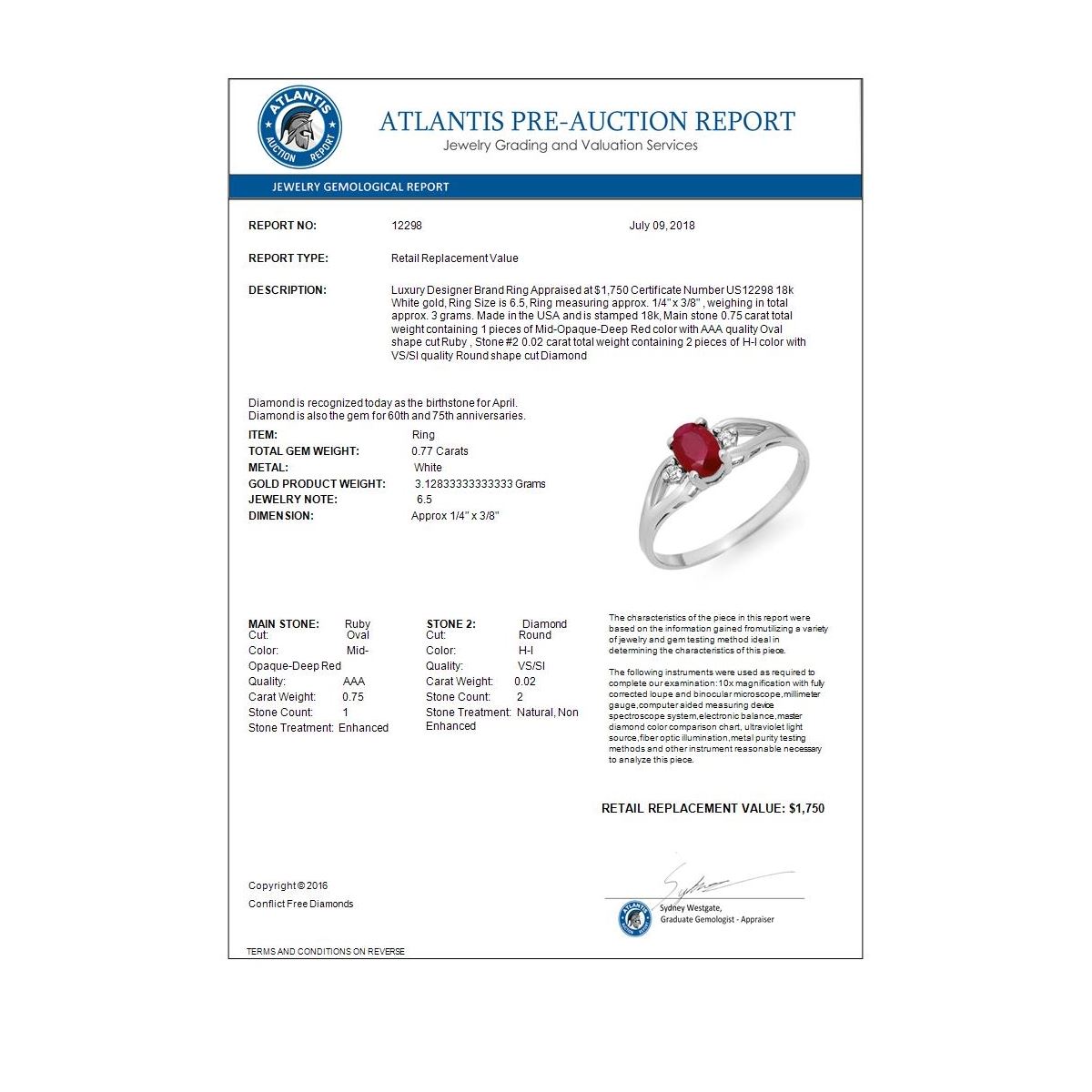 REF-26N5Y -12298 ---- 0.77 CTW Ruby & Diamond Ring 18K White Gold ---- Luxury Designer Brand Ring Appraised at $1,750 Certificate Number US12298 18k White gold, Ring Size is 6.5, Ring measuring approx. 1/4" x 3/8" , weighing in total approx. 3 grams. Made in the USA and is stamped 18k, Main stone 0.75 carat total weight containing 1 pieces of Mid-Opaque-Deep Red color with AAA quality Oval shape cut Ruby , Stone #2 0.02 carat total weight containing 2 pieces of H-I color with VS/SI quality Round shape cut Diamond