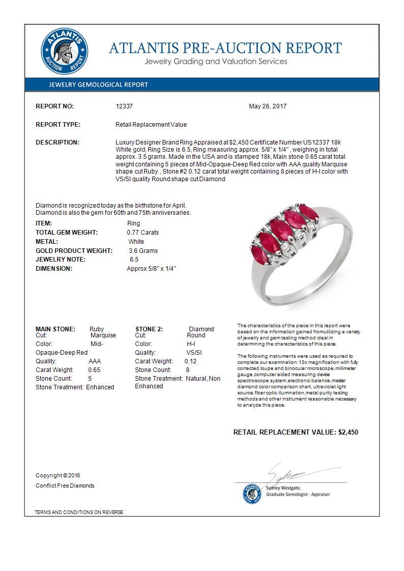 0.77 CTW Ruby & Diamond Ring 18K White Gold ---- Luxury Designer Brand Ring Appraised Retail Price at $2,450 ---- SKU Number US12337 18k White gold Ring Size is 6.5, Ring measuring approx. 5/8" x 1/4" , weighing in total approx. 3.5 grams. Made in the USA and is stamped 18k, Main stone 0.65 carat total weight containing 5 pieces of Mid-Opaque-Deep Red color with AAA quality Marquise shape cut Ruby , Stone #2 0.12 carat total weight containing 8 pieces of H-I color with VS/SI quality Round shape cut