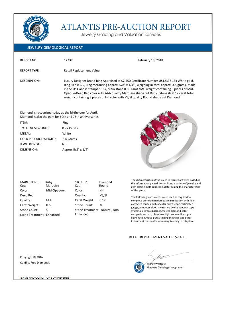 REF-37K3W -12337 ---- 0.77 CTW Ruby & Diamond Ring 18K White Gold ---- Luxury Designer Brand Ring Appraised at $2,450 Certificate Number US12337 18k White gold, Ring Size is 6.5, Ring measuring approx. 5/8" x 1/4" , weighing in total approx. 3.5 grams. Made in the USA and is stamped 18k, Main stone 0.65 carat total weight containing 5 pieces of Mid-Opaque-Deep Red color with AAA quality Marquise shape cut Ruby , Stone #2 0.12 carat total weight containing 8 pieces of H-I color with VS/SI quality Round shape cut Diamond