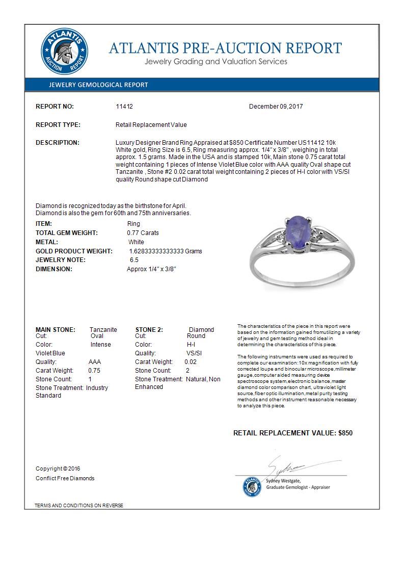 REF-12F2N -11412 ---- 0.77 CTW Tanzanite & Diamond Ring 10K White Gold ---- Luxury Designer Brand Ring Appraised at $850 Certificate Number US11412 10k White gold, Ring Size is 6.5, Ring measuring approx. 1/4" x 3/8" , weighing in total approx. 1.5 grams. Made in the USA and is stamped 10k, Main stone 0.75 carat total weight containing 1 pieces of Intense Violet Blue color with AAA quality Oval shape cut Tanzanite , Stone #2 0.02 carat total weight containing 2 pieces of H-I color with VS/SI quality Round shape cut Diamond