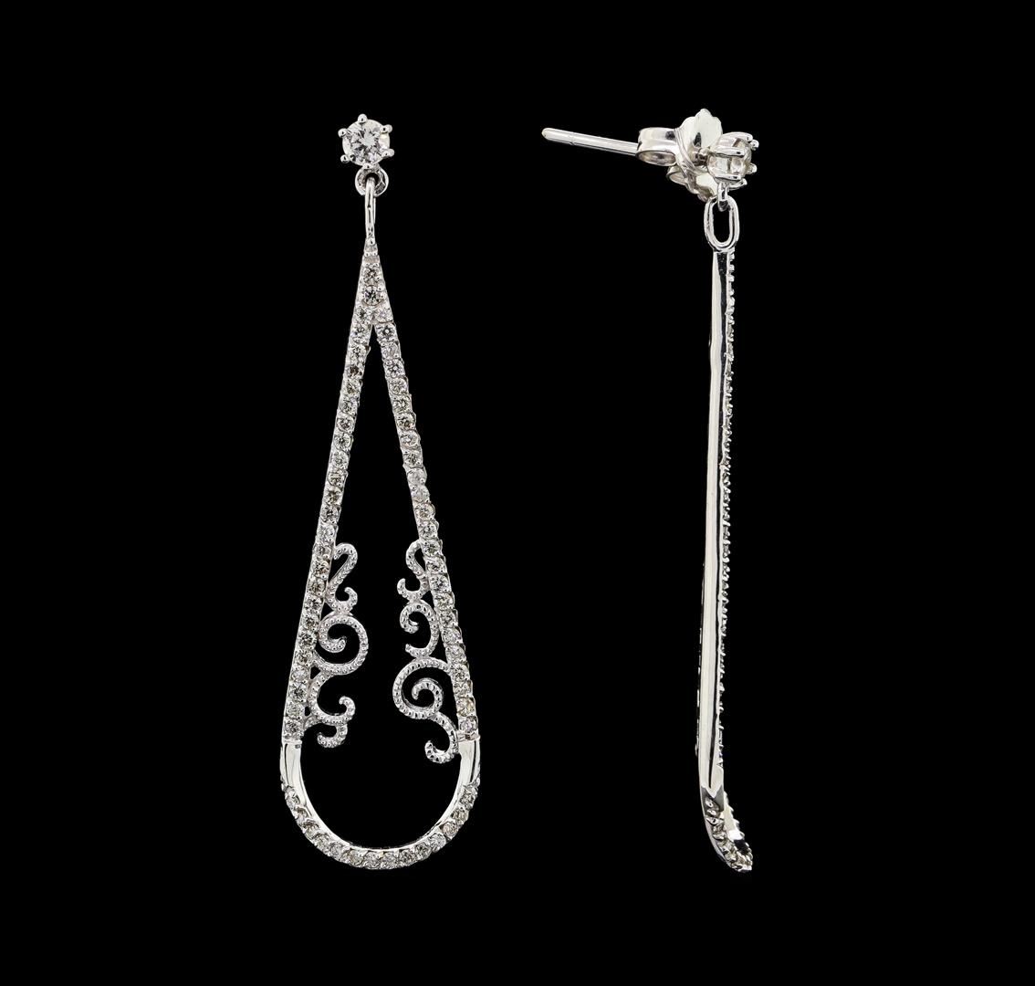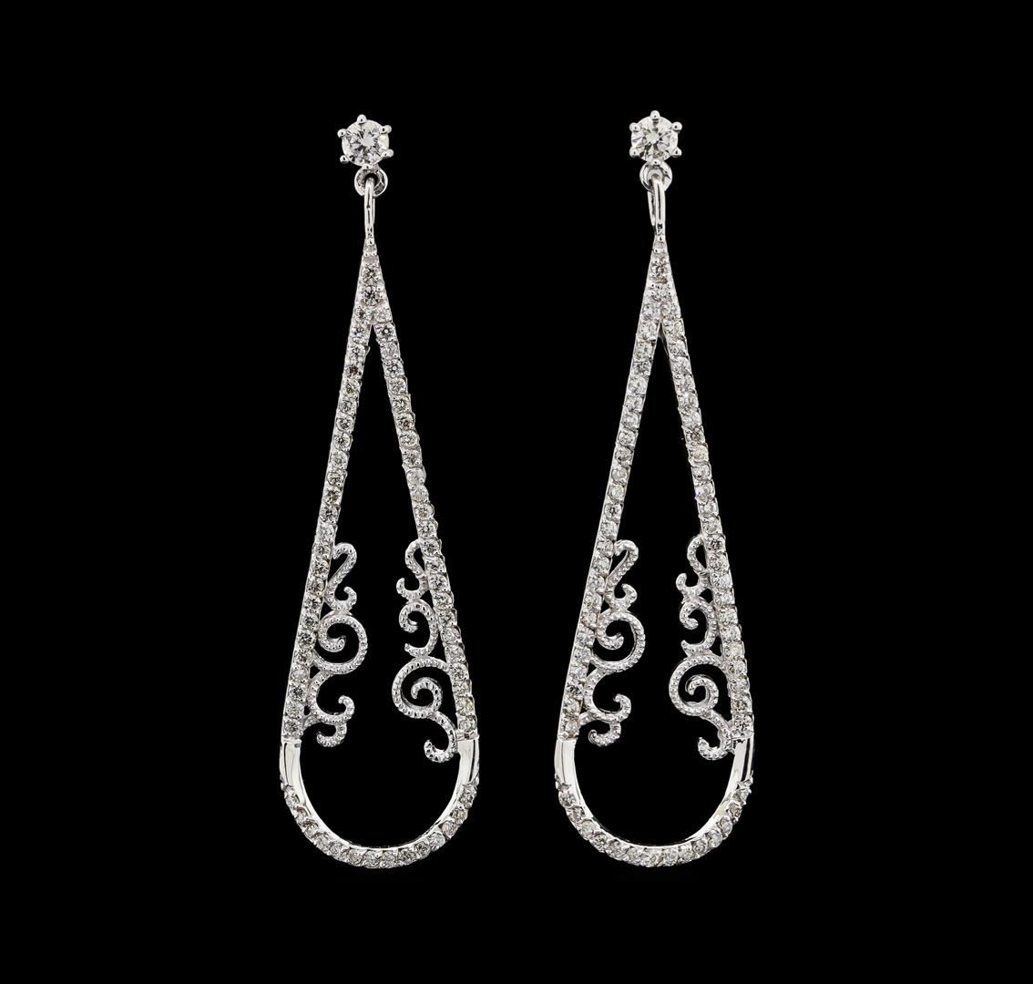 One pair electronically tested 14KT white gold lady's combination cast & assembled fashion dangle earrings with friction posts with a bright polish with milgrain detailing finish. The featured lady's earrings have a drop of approximately 45 millimeters. Identified with markings of '14K 585'. Condition is new, good workmanship. Containing: Two prong set round brilliant cut diamonds, measuring 2.90 - 2.80 x 1.71mm (depth est.) approximate total weight of 2 Stones = 0.16ct. Graded in the setting. Clarity SI-1. Color: H - I Cut Good One Hundred Twenty-Eight prong set round brilliant cut diamonds, measuring 1.15 - 1.05 x 0.66mm (depth est.) approximate total weight of 128 Stones = 0.61ct. Graded in the setting. Clarity SI-1 to SI-2. Color: H - J Cut Good. Total Weight of Diamonds 0.77ct.. Total Weight of Earrings 3.40gm. GAS Appraised at $3,445.00.