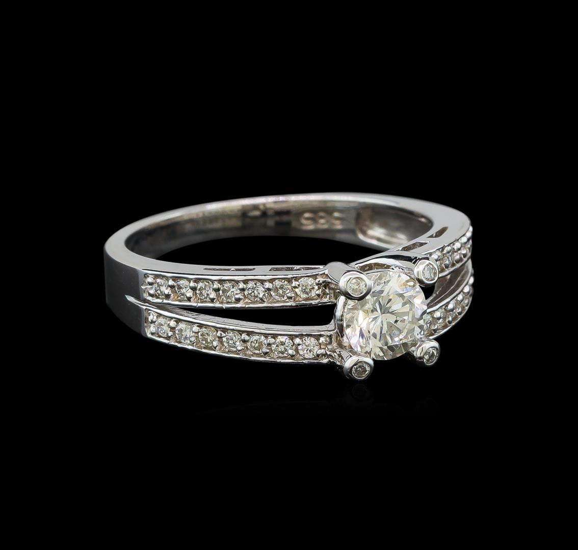 One electronically tested 14KT white gold lady's cast wedding ring with a split shank with a bright polish finish. The featured lady's ring has a shank measuring 2.24 millimeters wide. Identified with markings of '585'. Condition is new, good workmanship. Containing: One prong set round brilliant cut diamond, measuring 5.02 - 4.98 x 3.20mm (depth est.) approximate weight of 0.52ct. Graded in the setting. Clarity SI-2. Color: I - J Cut Good Twenty-Eight prong set round brilliant cut diamonds, measuring 1.30 - 1.25 x 0.79mm (depth est.) approximate total weight of 28 Stones = 0.22ct. Graded in the setting. Clarity SI-1 to SI-2. Color: H - I Cut Good Four bezel set round brilliant cut diamonds, measuring 1.20 - 1.10 x 0.71mm (depth est.) approximate total weight of 4 Stones = 0.03ct. Graded in the setting. Clarity SI-1 to I-1. Color: H - I Cut Good. Total Weight of Diamonds 0.77ct.. Total Weight of Ring 3.20gm. GAS Appraised at $4,875.00.