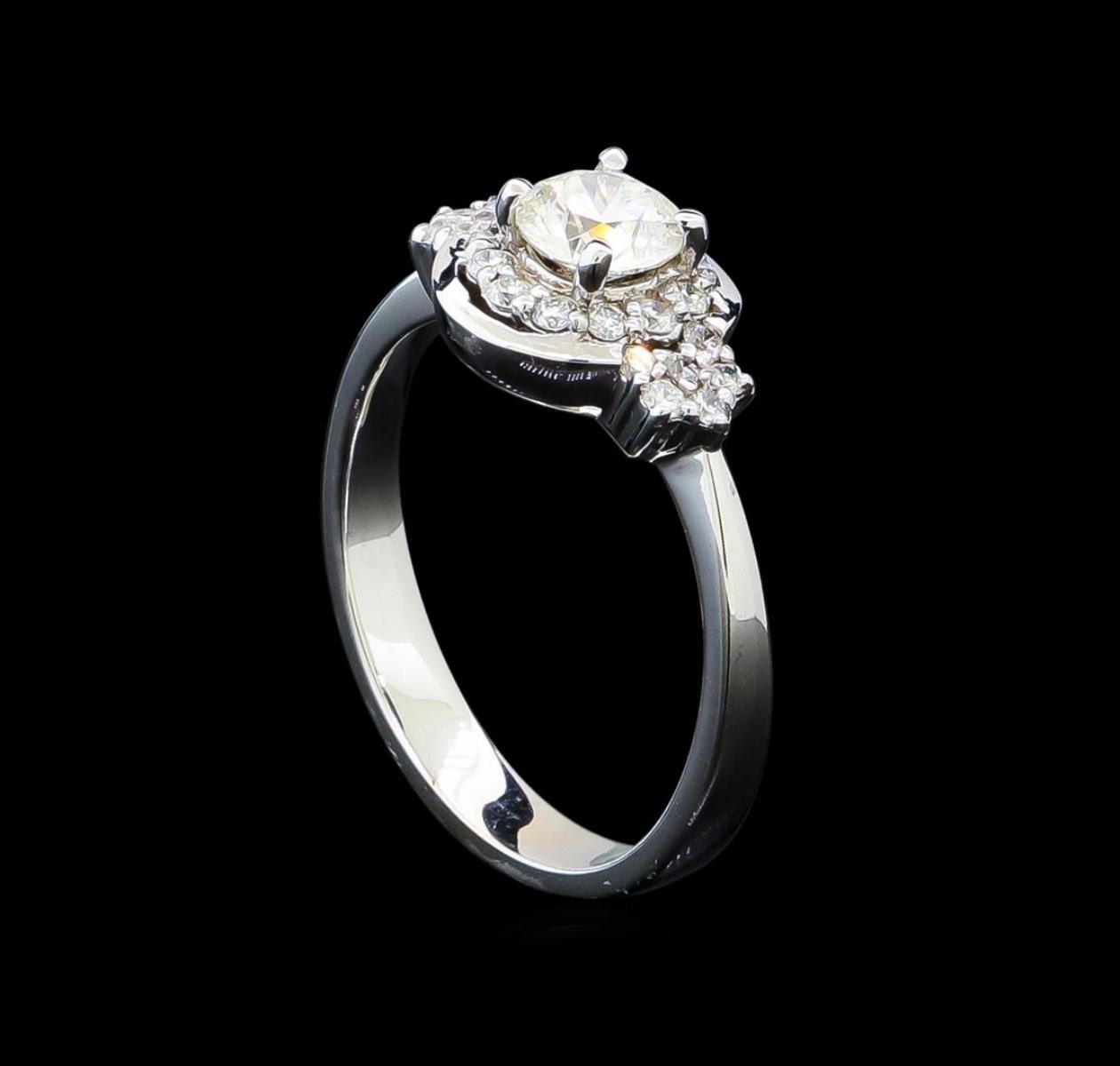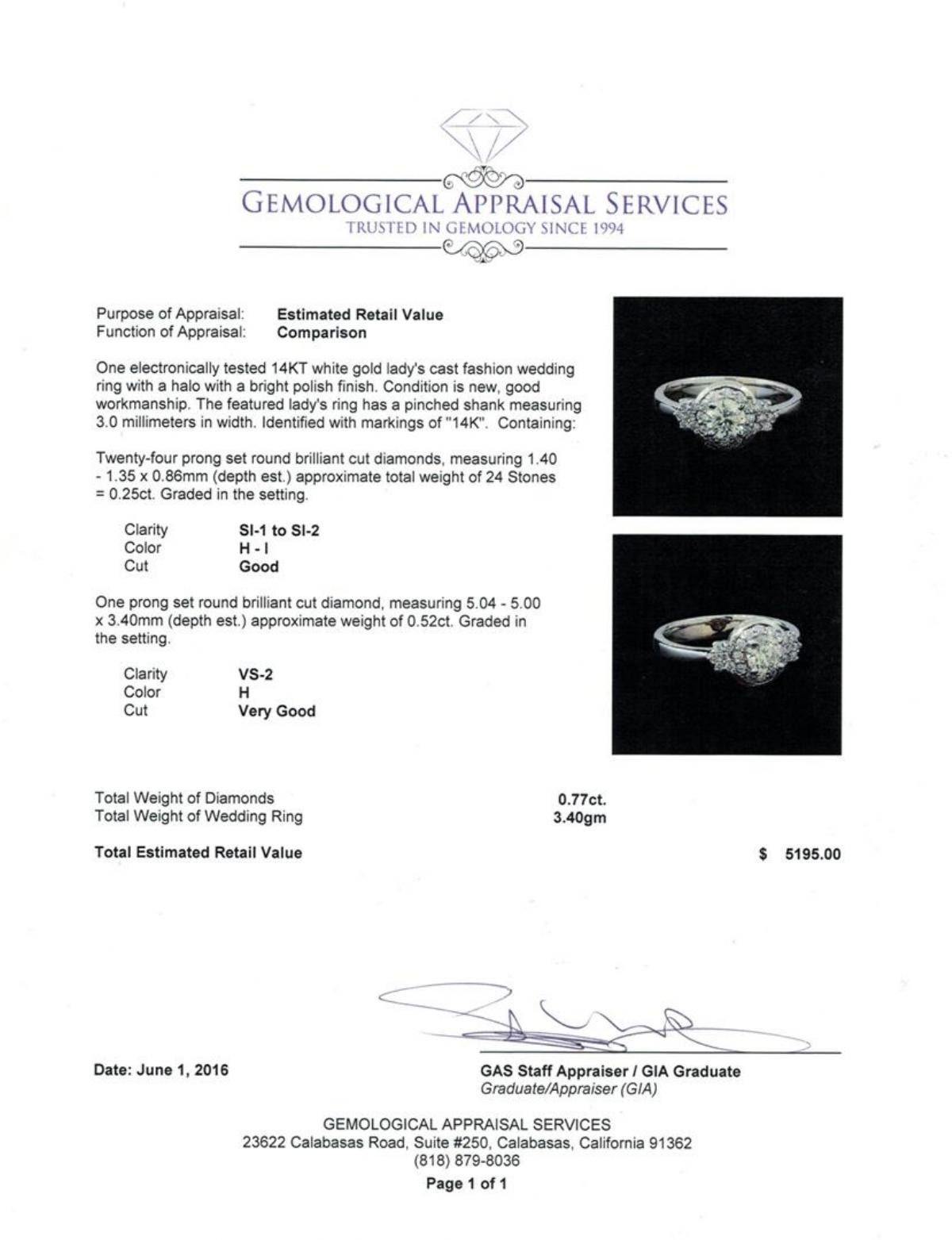 One electronically tested 14KT white gold lady's cast fashion wedding ring with a halo with a bright polish finish. The featured lady's ring has a pinched shank measuring 3.0 millimeters in width. Identified with markings of "14K". Condition is new, good workmanship. Containing: Twenty-Four prong set round brilliant cut diamonds, measuring 1.40 - 1.35 x 0.86mm (depth est.) approximate total weight of 24 Stones = 0.25ct. Graded in the setting. Clarity: SI-1 to SI-2. Color: H - I. Cut Good One prong set round brilliant cut diamond, measuring 5.04 - 5.00 x 3.40mm (depth est.) approximate weight of 0.52ct. Graded in the setting. Clarity: VS-2. Color:  Very Good. Total Weight of Diamonds 0.77ct. Total Weight of Wedding Ring 3.40gm. GAS Appraised.