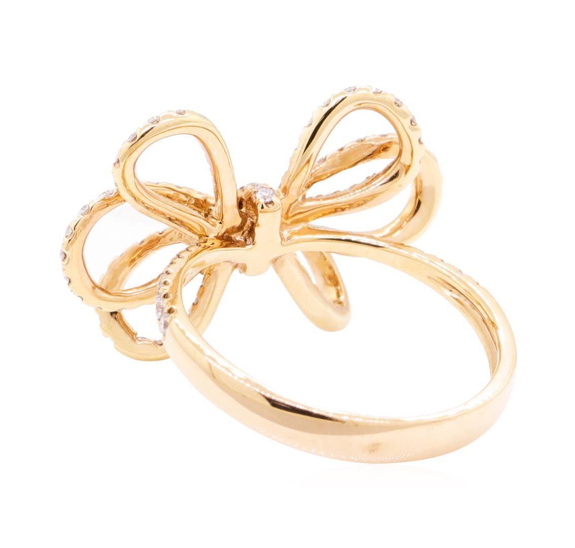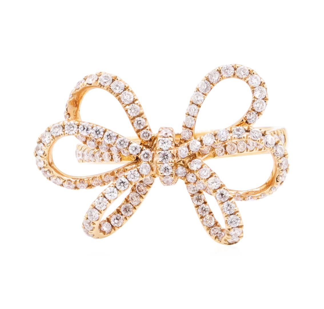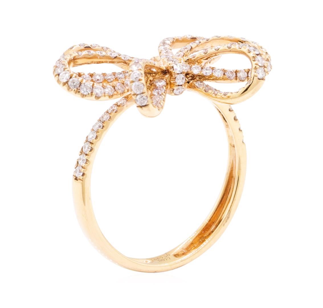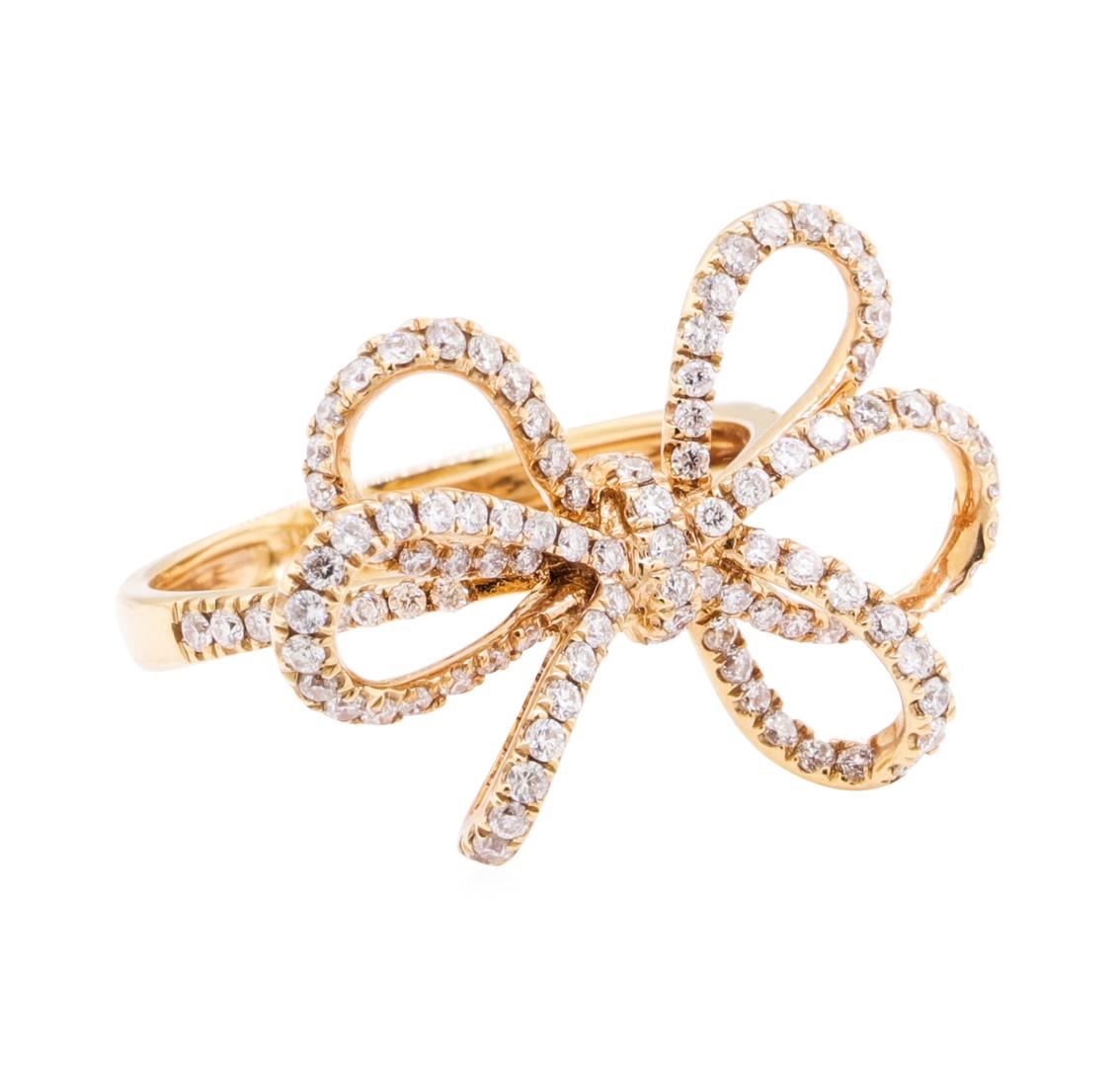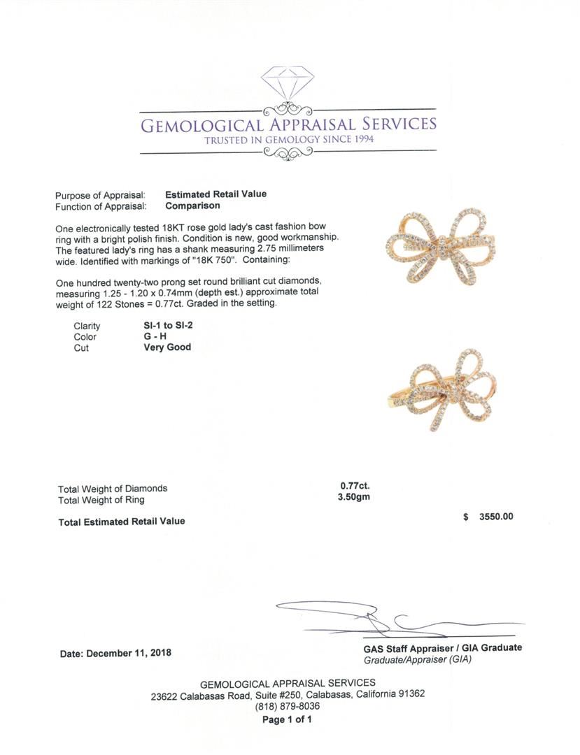 One electronically tested 18KT rose gold lady's cast fashion bow ring with a bright polish finish. The featured lady's ring has a shank measuring 2.75 millimeters wide. Identified with markings of '18K 750'. Condition is new, good workmanship. Containing: One Hundred Twenty-Two prong set round brilliant cut diamonds, measuring 1.25 - 1.20 x 0.74mm (depth est.) approximate total weight of 122 Stones = 0.77ct. Graded in the setting. Color G - H Clarity SI-1 to SI-2 Cut Very Good. Total Weight of Diamonds 0.77ct.. Total Weight of Ring 3.50gm GAS Appraised at $3550.00. GAS Appraised at $3,550.00.