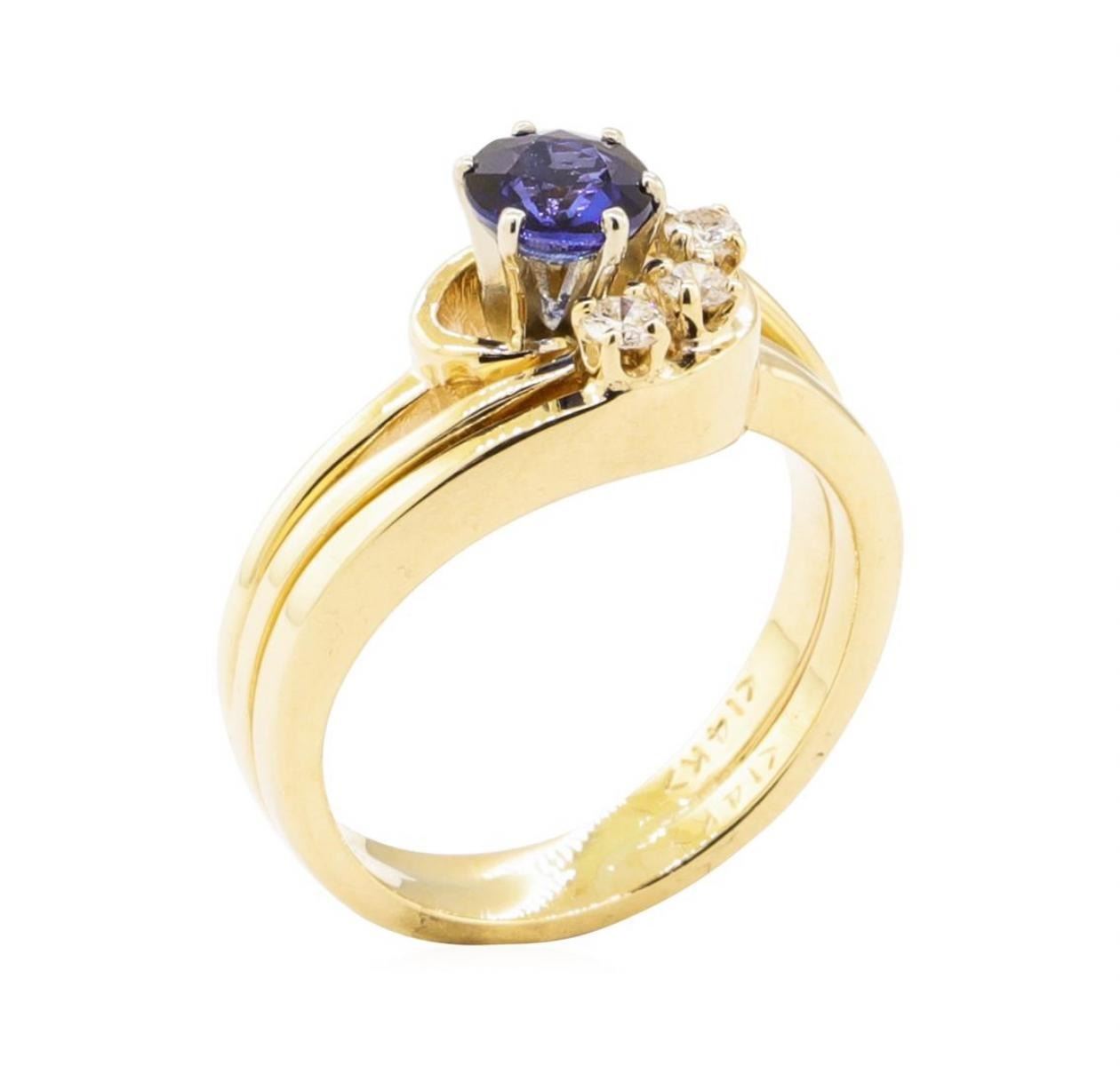 One ring featuring: 14KT yellow gold weighing 5.3 grams containing one blue sapphire weighing 0.68ct and diamonds weighing 0.10 ctw.