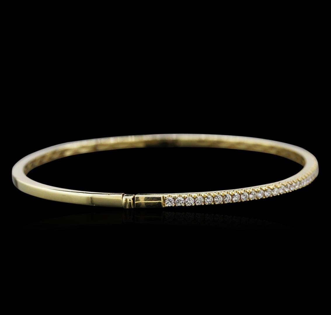 One electronically tested 14KT yellow gold ladies cast & assembled diamond bangle bracelet with a bright polish finish. Six and one-half inch wearable length diamond bangle bracelet features a diamond set curvature supported by hinged shoulders, terminating in a concealed clasp. Condition is good. Containing: Forty-Nine prong set round brilliant cut diamonds, measuring 1.60 - 1.50 x 0.93mm (depth est.) approximate total weight of 49 Stones = 0.78ct. Graded in the setting. Clarity: SI-2 to I-1. Color: G - I. Total Weight of Diamonds 0.78ct. Total Weight of Bangle Bracelet 6.19gm. AIG Appraised at $3,195.00.