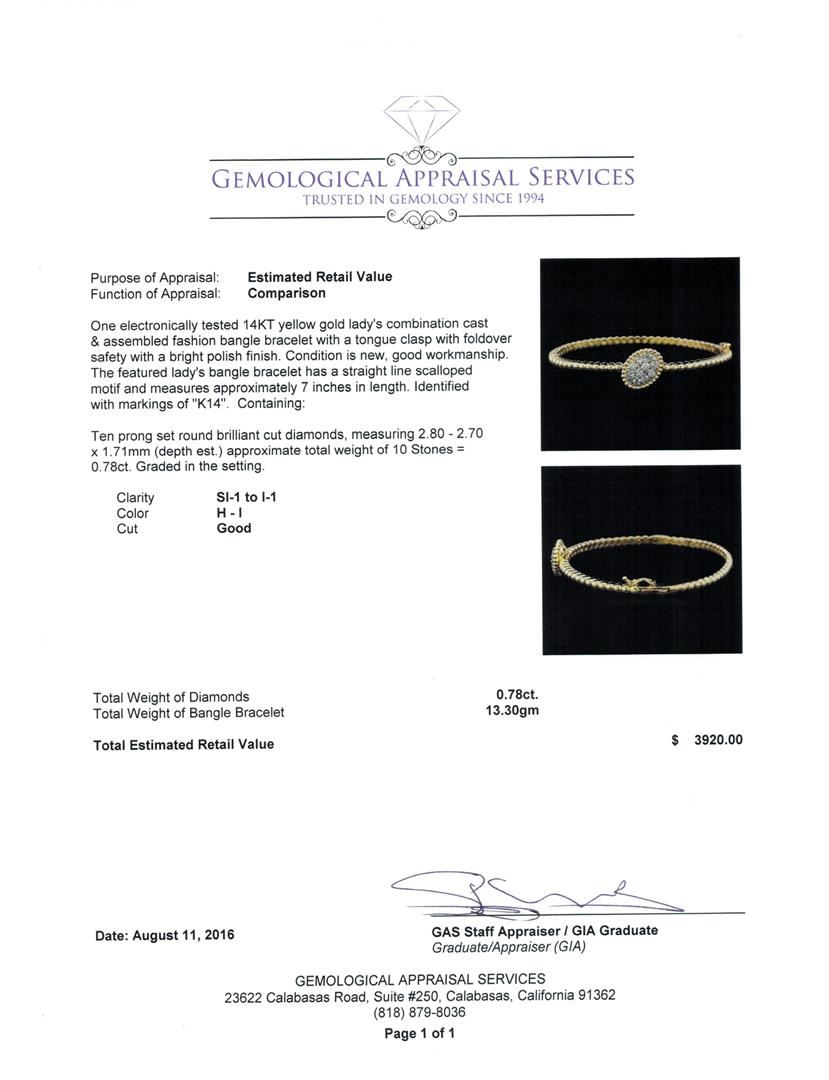 One electronically tested 14KT yellow gold lady's combination cast & assembled fashion bangle bracelet with a tongue clasp with foldover safety with a bright polish finish. The featured lady's bangle bracelet has a straight line scalloped motif and measures approximately 7 inches in length. Identified with markings of 'K14'. Condition is new, good workmanship. Containing: Ten prong set round brilliant cut diamonds, measuring 2.80 - 2.70 x 1.71mm (depth est.) approximate total weight of 10 Stones = 0.78ct. Graded in the setting. Clarity SI-1 to I-1. Color: H - I Cut Good. Total Weight of Diamonds 0.78ct.. Total Weight of Bangle Bracelet 13.30gm. GAS Appraised at $3,920.00.