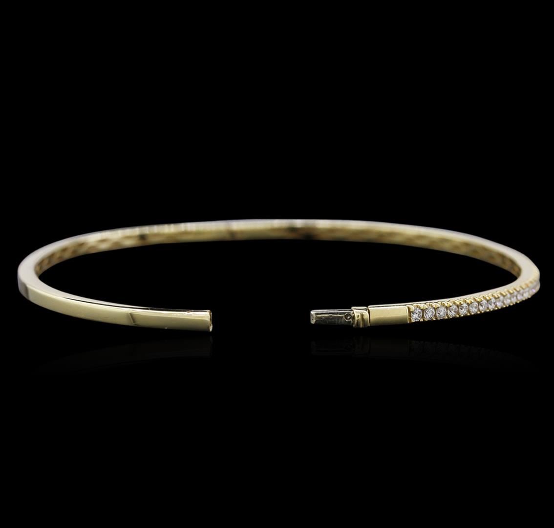One electronically tested 14KT yellow gold ladies cast & assembled diamond bangle bracelet with a bright polish finish. Six and one-half inch wearable length diamond bangle bracelet features a diamond set curvature supported by hinged shoulders, terminating in a concealed clasp. Condition is good. Containing: Forty-Nine prong set round brilliant cut diamonds, measuring 1.60 - 1.50 x 0.93mm (depth est.) approximate total weight of 49 Stones = 0.78ct. Graded in the setting. Clarity: SI-2 to I-1. Color: G - I. Total Weight of Diamonds 0.78ct. Total Weight of Bangle Bracelet 6.19gm. AIG Appraised at $3,195.00.