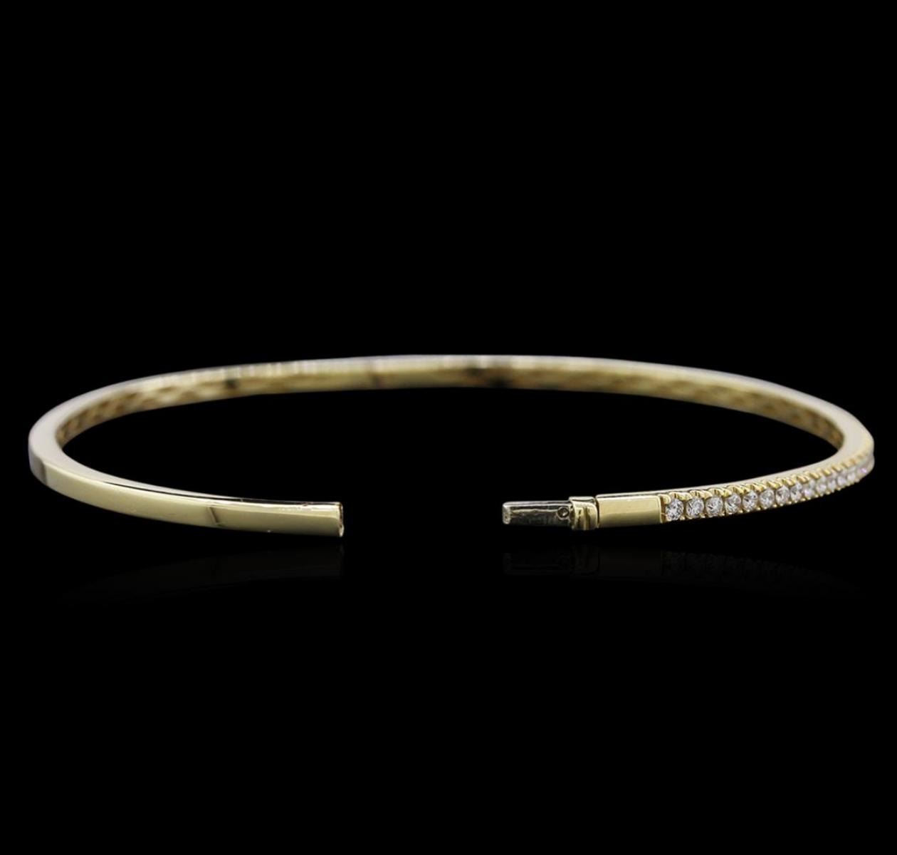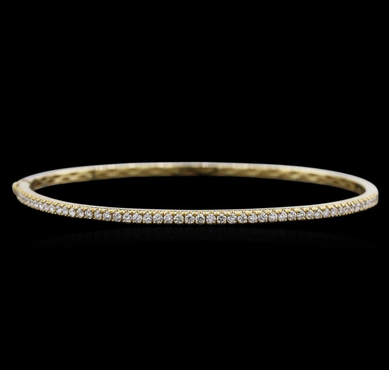 One electronically tested 14KT yellow gold ladies cast & assembled diamond bangle bracelet with a bright polish finish. Six and one-half inch wearable length diamond bangle bracelet features a diamond set curvature supported by hinged shoulders, terminating in a concealed clasp. Condition is good. Containing: Forty-Nine prong set round brilliant cut diamonds, measuring 1.60 - 1.50 x 0.93mm (depth est.) approximate total weight of 49 Stones = 0.78ct. Graded in the setting. Clarity: SI-2 to I-1. Color: G - I. Total Weight of Diamonds 0.78ct. Total Weight of Bangle Bracelet 6.19gm. AIG Appraised.