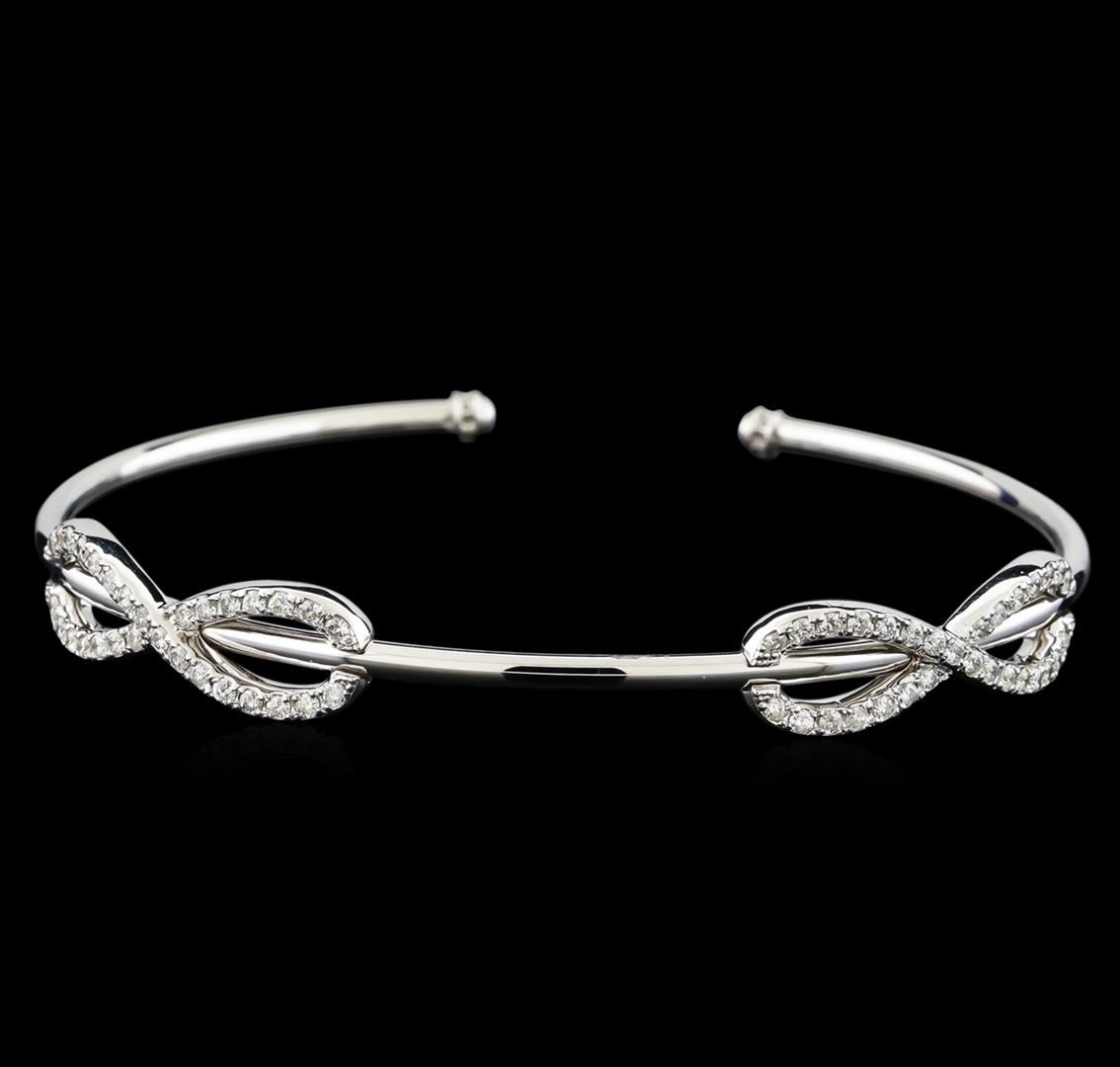 One electronically tested 14KT white gold lady's cast fashion cuff bracelet with a bright polish finish. The featured lady's cuff bracelet has a circumference of approximately 7 inches. Condition is new, good workmanship. Containing: Sixty prong set round brilliant cut diamonds, measuring 1.55 - 1.45 x 0.93mm (depth est.) approximate total weight of 60 Stones = 0.78ct. Graded in the setting. Clarity: SI-2 to I-1. Color: H - I. Cut Good. Total Weight of Diamonds 0.78ct. Total Weight of Cuff Bracelet 9.30gm GAS Appraised at $3,545.00.
