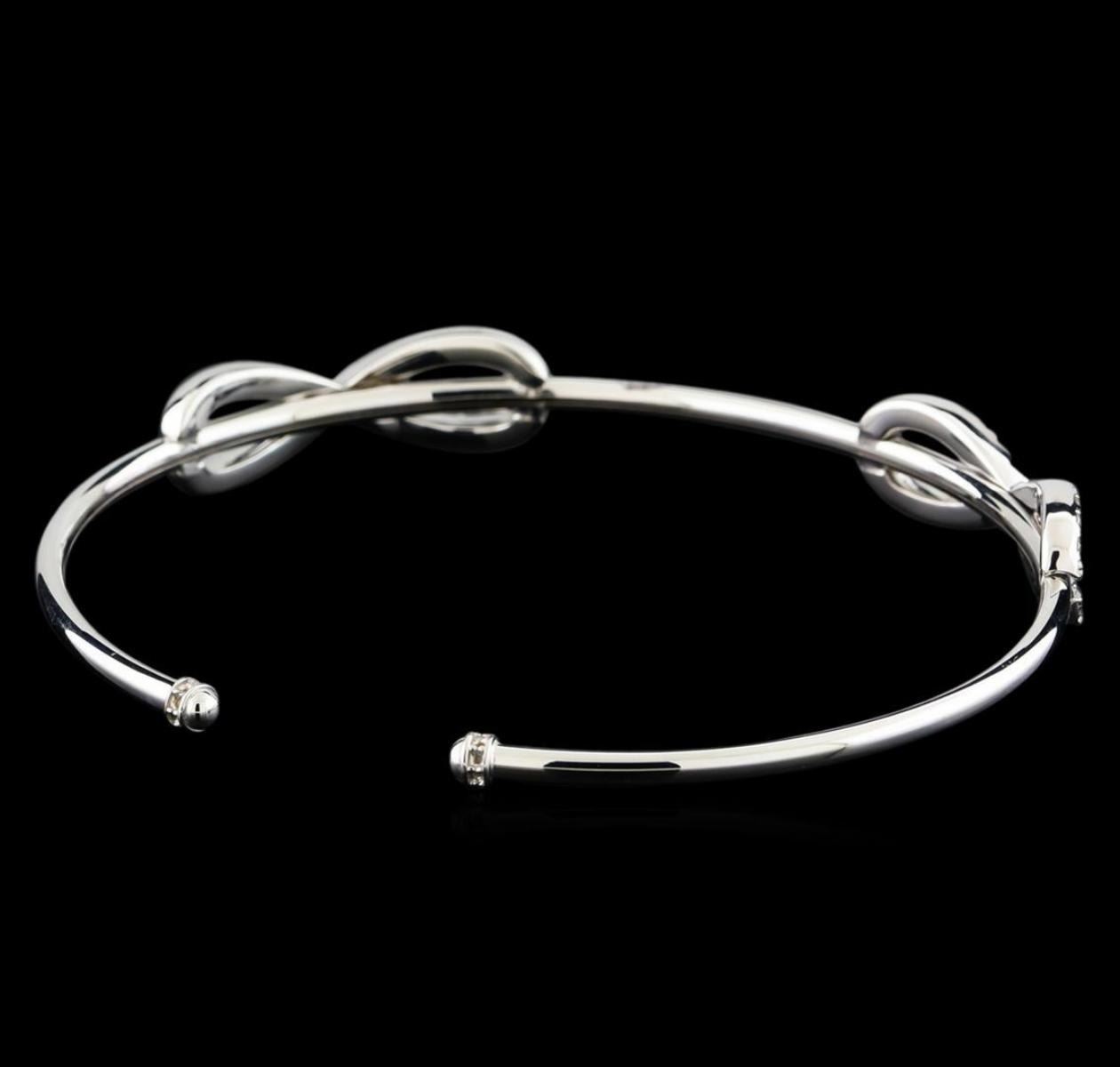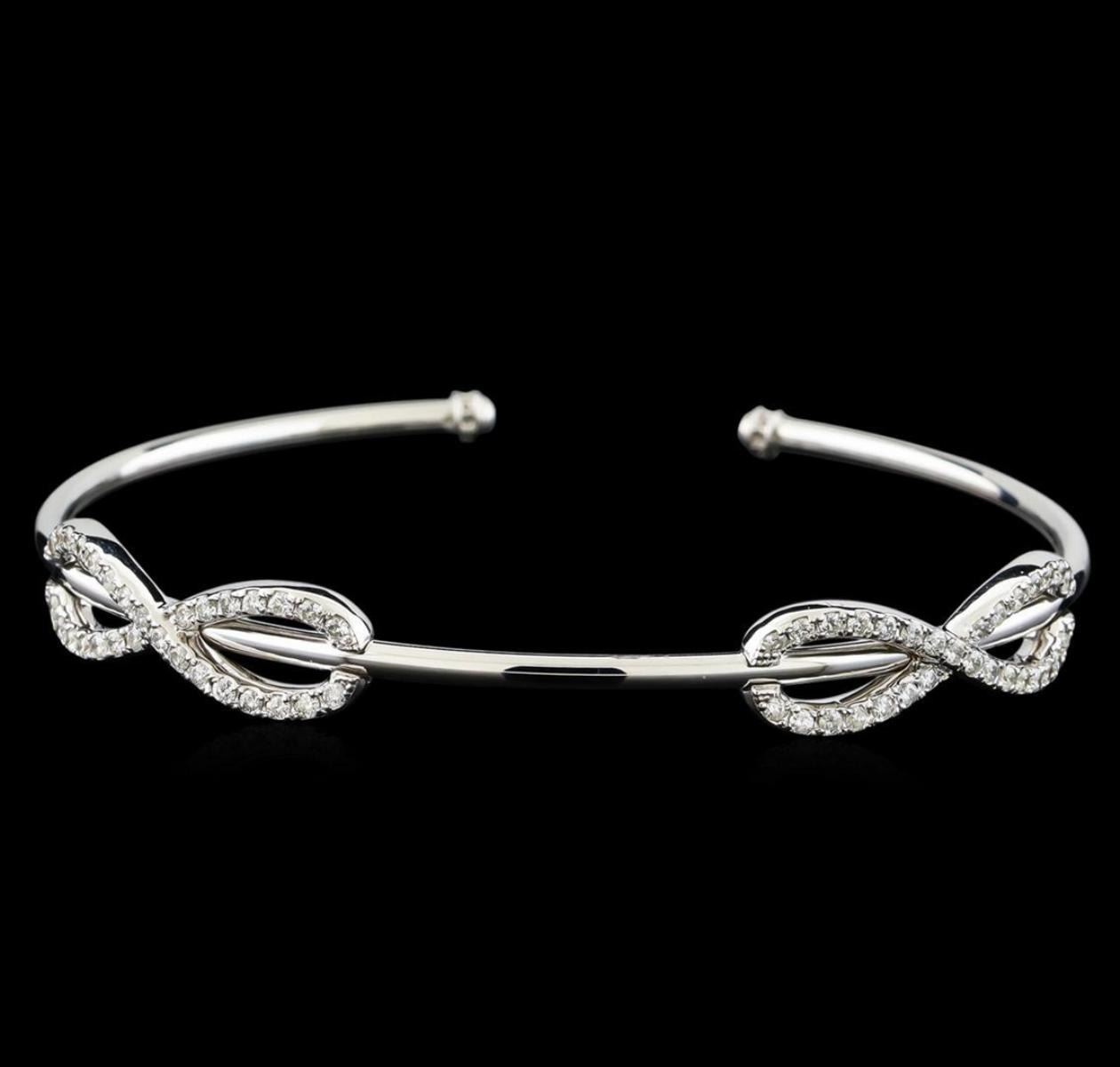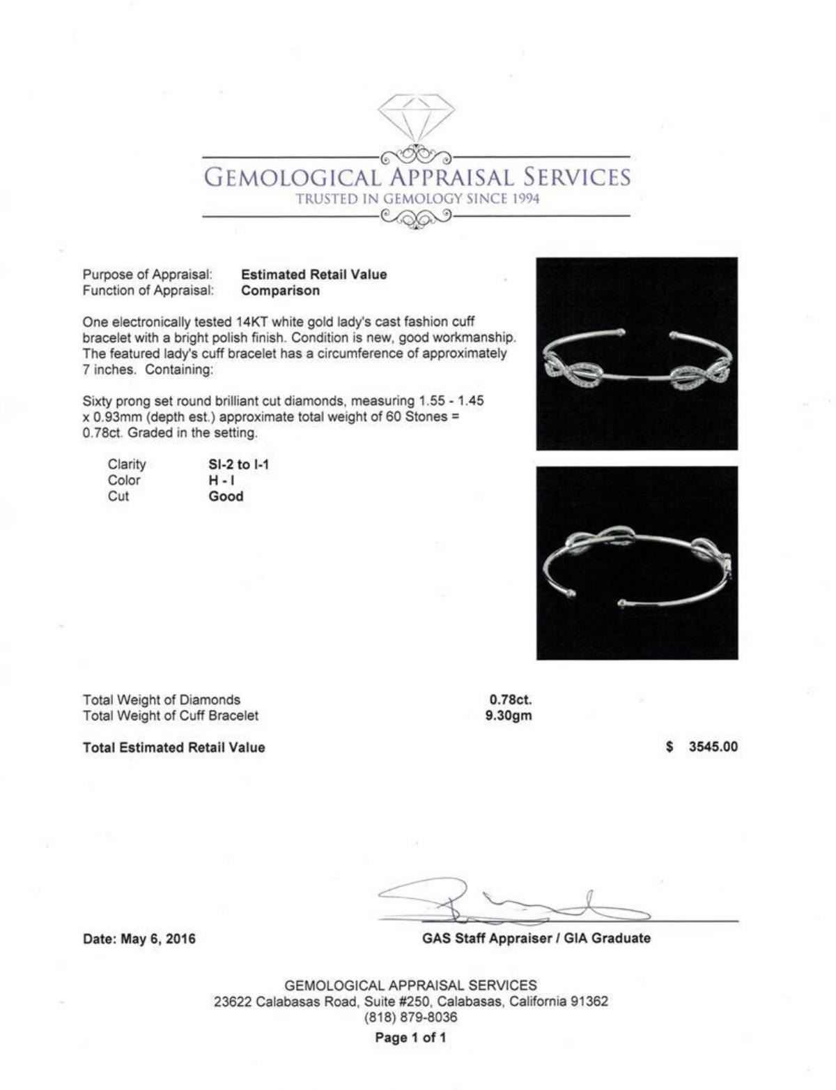 One electronically tested 14KT white gold lady's cast fashion cuff bracelet with a bright polish finish. The featured lady's cuff bracelet has a circumference of approximately 7 inches. Condition is new, good workmanship. Containing: Sixty prong set round brilliant cut diamonds, measuring 1.55 - 1.45 x 0.93mm (depth est.) approximate total weight of 60 Stones = 0.78ct. Graded in the setting. Clarity: SI-2 to I-1. Color: H - I. Cut Good. Total Weight of Diamonds 0.78ct. Total Weight of Cuff Bracelet 9.30gm GAS Appraised.