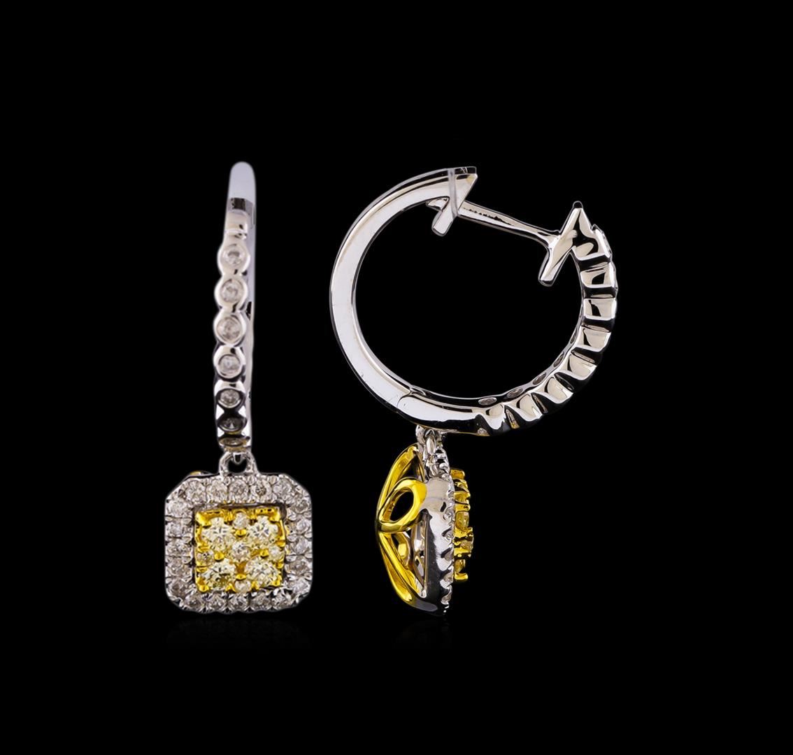 One pair electronically tested 14KT white and yellow gold lady's combination cast & assembled fashion dangle earrings with hinged, snap locking posts with a bright polish finish. The featured lady's earrings have a square cushion dangle and measure 30 millimeters in length. Identified with markings of '14K'. Condition is new, good workmanship. Containing: Ten prong set round brilliant cut diamonds, measuring 2.10 - 2.00 x 1.27mm (depth est.) approximate total weight of 10 Stones = 0.33ct. Graded in the setting. Clarity VS-2 to SI-1 Cut Good Eight prong set round brilliant cut diamonds, measuring 1.10 - 1.00 x 0.65mm (depth est.) approximate total weight of 8 Stones = 0.04ct. Graded in the setting. Clarity VS-1 to VS-2 Cut Very Good Forty prong set round brilliant cut diamonds, measuring 1.30 - 1.20 x 0.77mm (depth est.) approximate total weight of 40 Stones = 0.29ct. Graded in the setting. Clarity SI-1 to I-1. Color: H - I Cut Good Sixteen bezel set round brilliant cut diamonds, measuring 1.30 - 1.20 x 0.78mm (depth est.) approximate total weight of 16 Stones = 0.12ct. Graded in the setting. Clarity SI-1 to SI-2. Color: H - I Cut Good. Total Weight of Diamonds 0.78ct.. Total Weight of Earrings 4.70gm. GAS Appraised at $3,370.00.