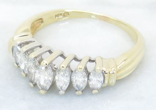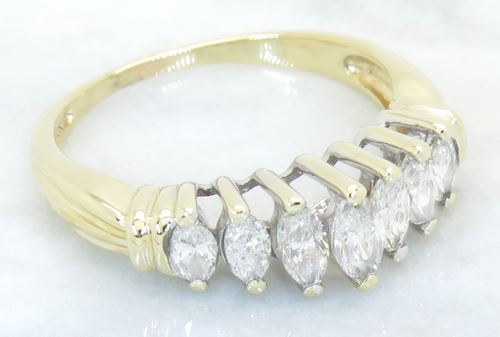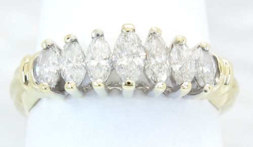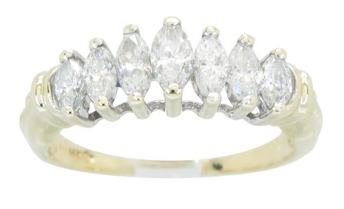 One tested 14K yellow gold .78CTW diamond ring. Containing: 7 Marquise Cut Diamonds. Clarity: I, Color: G-I. Approximate total diamond weight: .78CTW. All diamonds are graded in the mounting unless otherwise stated. Weight of ring: 3.9 grams, Size: 7.75.
