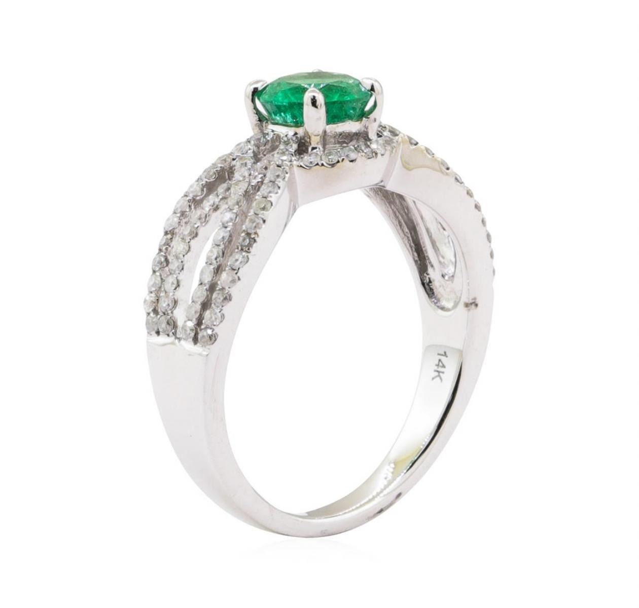 One electronically tested 14KT white gold ladies cast & assembled emerald & diamond ring. The ring features an emerald set within a diamond bezel, supported by four diamond ribbons at the shoulders, completed by a two millimeter wide band. Bright polish finish. Trademark is Orianne. Identified with markings of "14K". Condition is new, good workmanship. Containing: One prong set round mixed cut natural emerald, measuring 6.00 - 6.00 x 3.70 mm, exact weight 0.78ct., clarity is moderately included, type III, medium, very slightly grayish, green color, (GIA G 5/3), cut is good. Transmitting light somewhat diffusely, transparent to translucent. Naturally occurring internal & external characteristics are present. Indications of oil residue. Graded in the setting. One Hundred Four prong set round brilliant cut diamonds exact total weight 104 Stones = 0.44ct. The color grade reflects the overall average for the group. Graded in the setting. Clarity I-1 to I-3 Color F - H Total Weight of Colored Stones0.78 ct. Total Weight of Diamonds 0.44 ct. Total Weight of Ring 4.00 gm Estimated Retail Value $ 4,650.00 US
