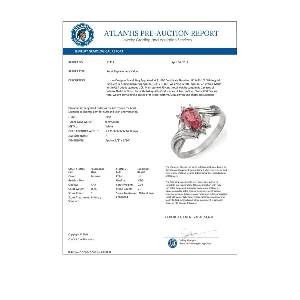 REF-20W8F -11423 ---- 0.79 CTW Pink Tourmaline & Diamond Ring 10K White Gold ---- Luxury Designer Brand Ring Appraised at $1,600 Certificate Number US11423 10k White gold, Ring Size is 7, Ring measuring approx. 3/8" x 3/16" , weighing in total approx. 2.1 grams. Made in the USA and is stamped 10k, Main stone 0.75 carat total weight containing 1 pieces of Intense Reddish Pink color with AAA quality Oval shape cut Tourmaline , Stone #2 0.04 carat total weight containing 2 pieces of H-I color with VS/SI quality Round shape cut Diamond