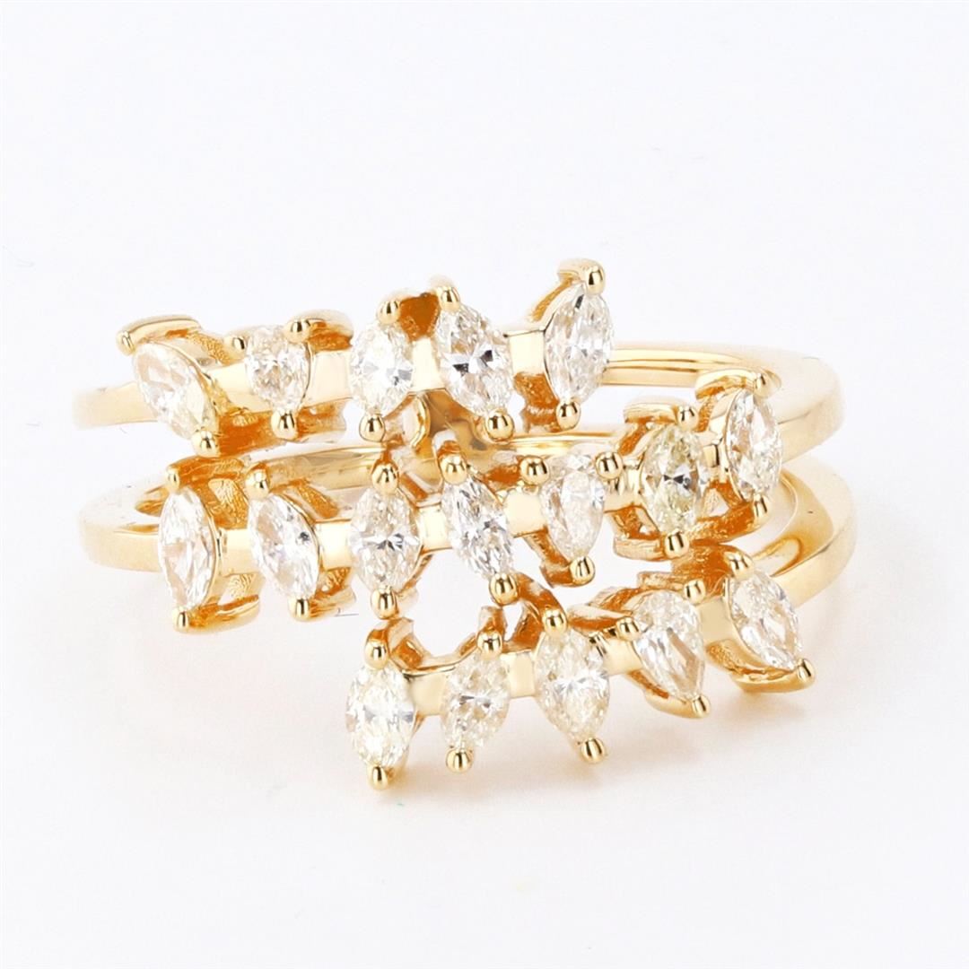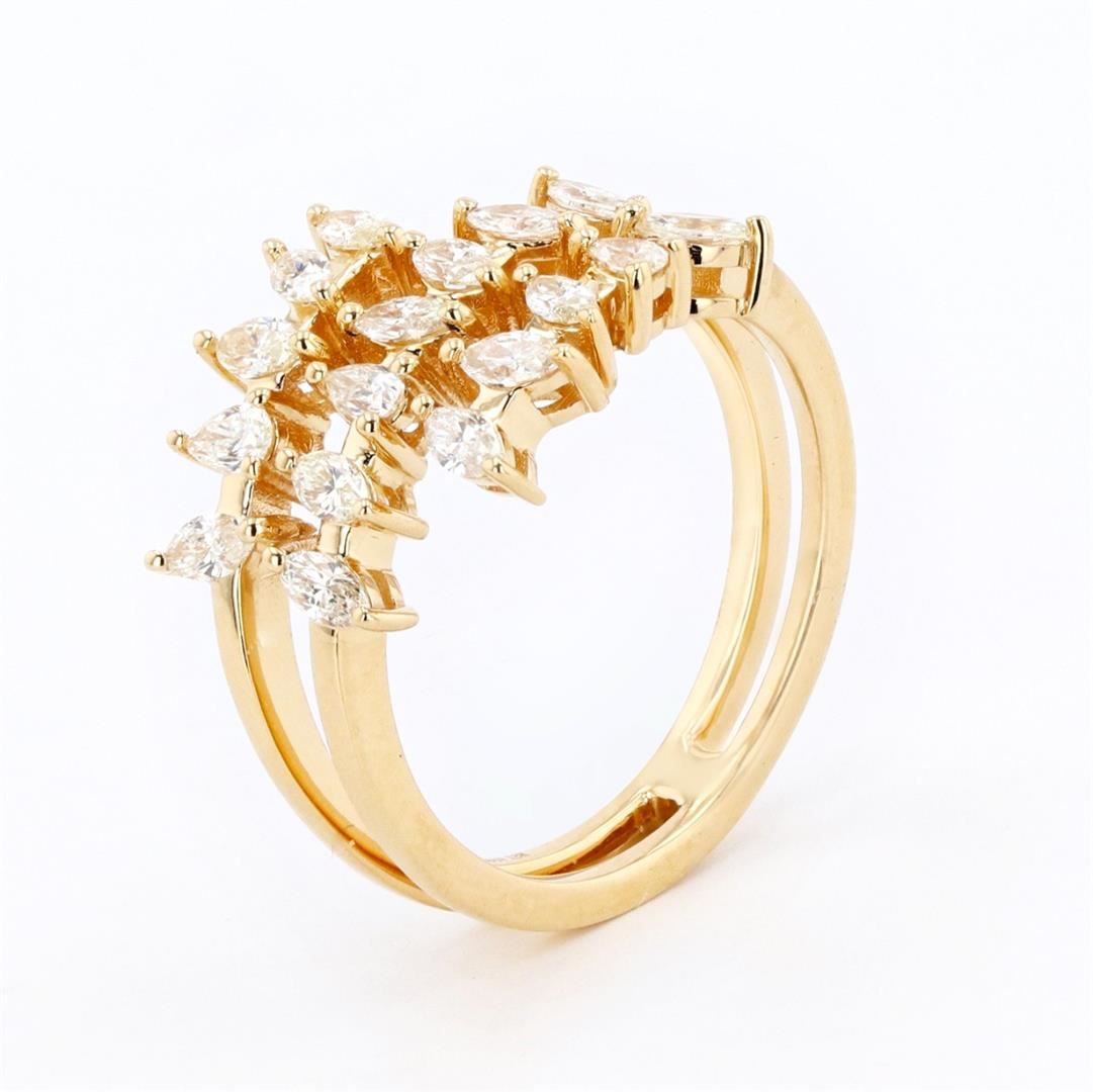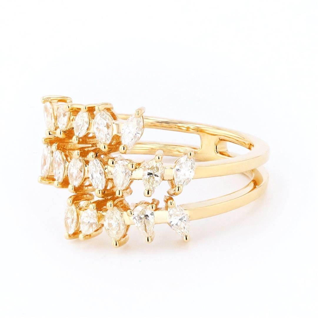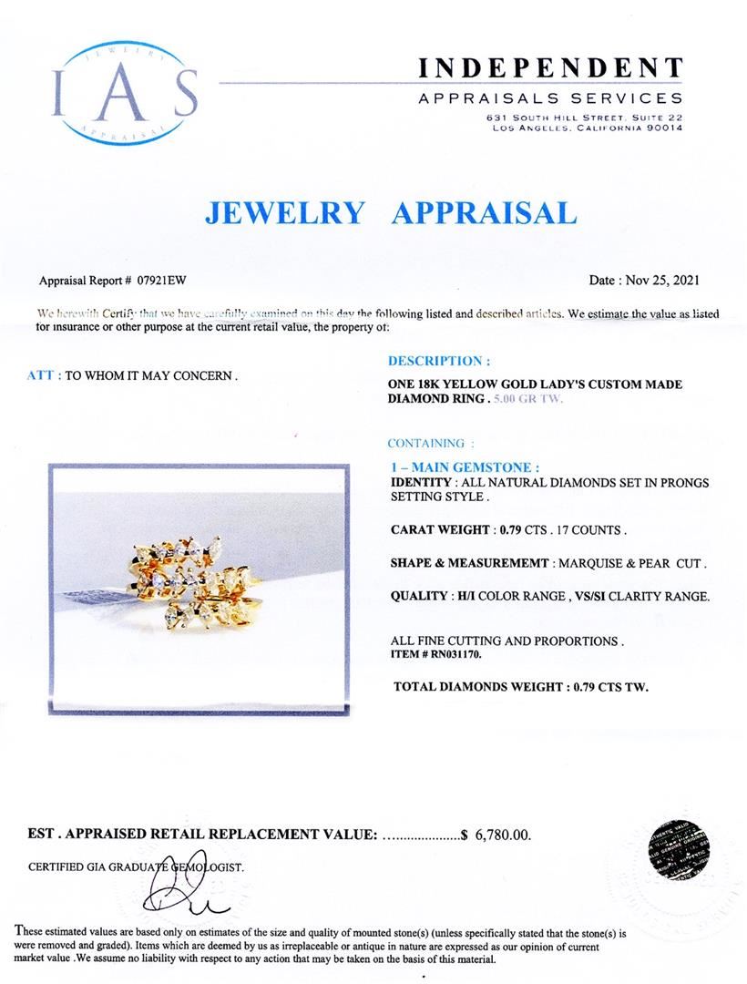 0.79ctw Diamond 18K Yellow Gold Ring. Please see Photos and Description for all available information. This ring features 17 diamonds in a marquise and pear cut, totaling 0.79ctw. It is set in 18K yellow gold and is available in a size 6 3/4.