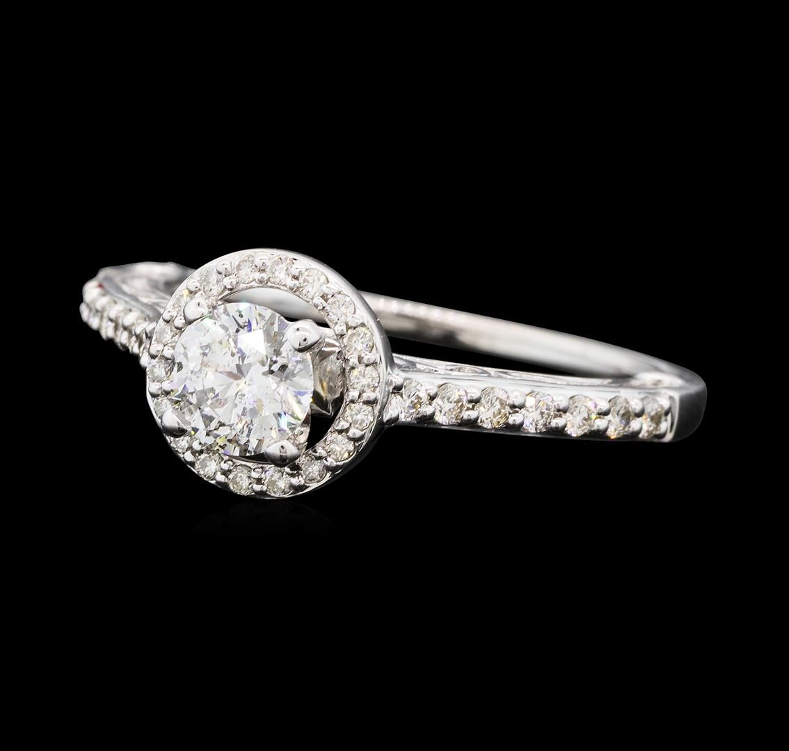 One electronically tested 14KT white gold lady's cast wedding ring with a cathedral shank with a halo with a bright polish finish. The featured lady's ring has a shank measuring 1.25 millimeters wide. Identified with markings of '14K'. Condition is new, good workmanship. Containing: One prong set round brilliant cut diamond, measuring 5.10 - 5.08 x 3.26mm (depth est.) approximate weight of 0.52ct. Graded in the setting. Color H - I Clarity I-1 Cut Very Good Sixteen prong set round brilliant cut diamonds, measuring 1.40 - 1.30 x 0.84mm (depth est.) approximate total weight of 16 Stones = 0.16ct. Graded in the setting. Color H - I Clarity SI-1 to SI-2 Cut Very Good Twenty-Two prong set round brilliant cut diamonds, measuring 1.20 - 1.00 x 0.68mm (depth est.) approximate total weight of 22 Stones = 0.11ct. Graded in the setting. Color H - I Clarity SI-1 to SI-2 Cut Very Good. Total Weight of Diamonds 0.79ct.. Total Weight of Ring 3.30gm GAS Appraised at $4,255.00.